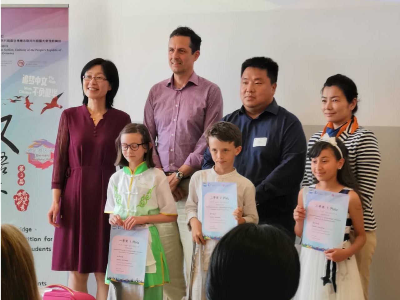 本次比赛共有17名中学生和9名小学生参加。其中小学生组的选手年龄都在10岁以下,除了要用一段汉语自我介绍外,还要展示与中国文化相关的才艺。经过上下午激烈角逐,来自汉堡的小选手宝丽娜最后以流利的汉语和颇见功夫的中国武术秀——剑术、棍术、拳术给评委和观众留下深刻的印象,最后拔得头筹。而小时候在上海生活过的倪克礼口齿伶俐,他讲《乌鸦喝水》的故事和绕口令《八百标兵奔北坡》赢得现场阵阵喝彩,最后获得第二名。可爱的四年级小学生萨及雅擅长歌舞,她演唱了《四季歌》并跳了《小苹果》,充满童真的表演得到了评委的认可,萨及雅获得本次比赛的第三名。