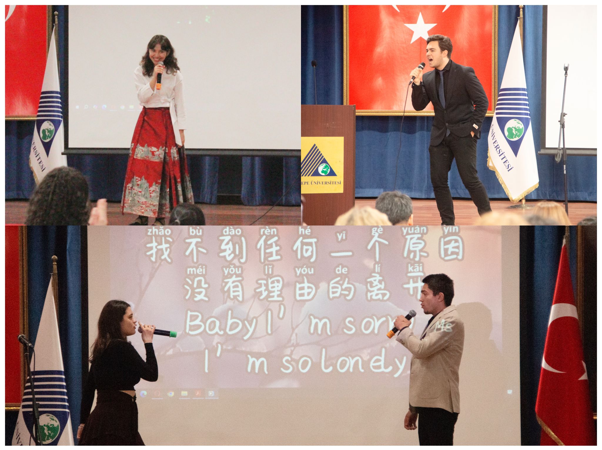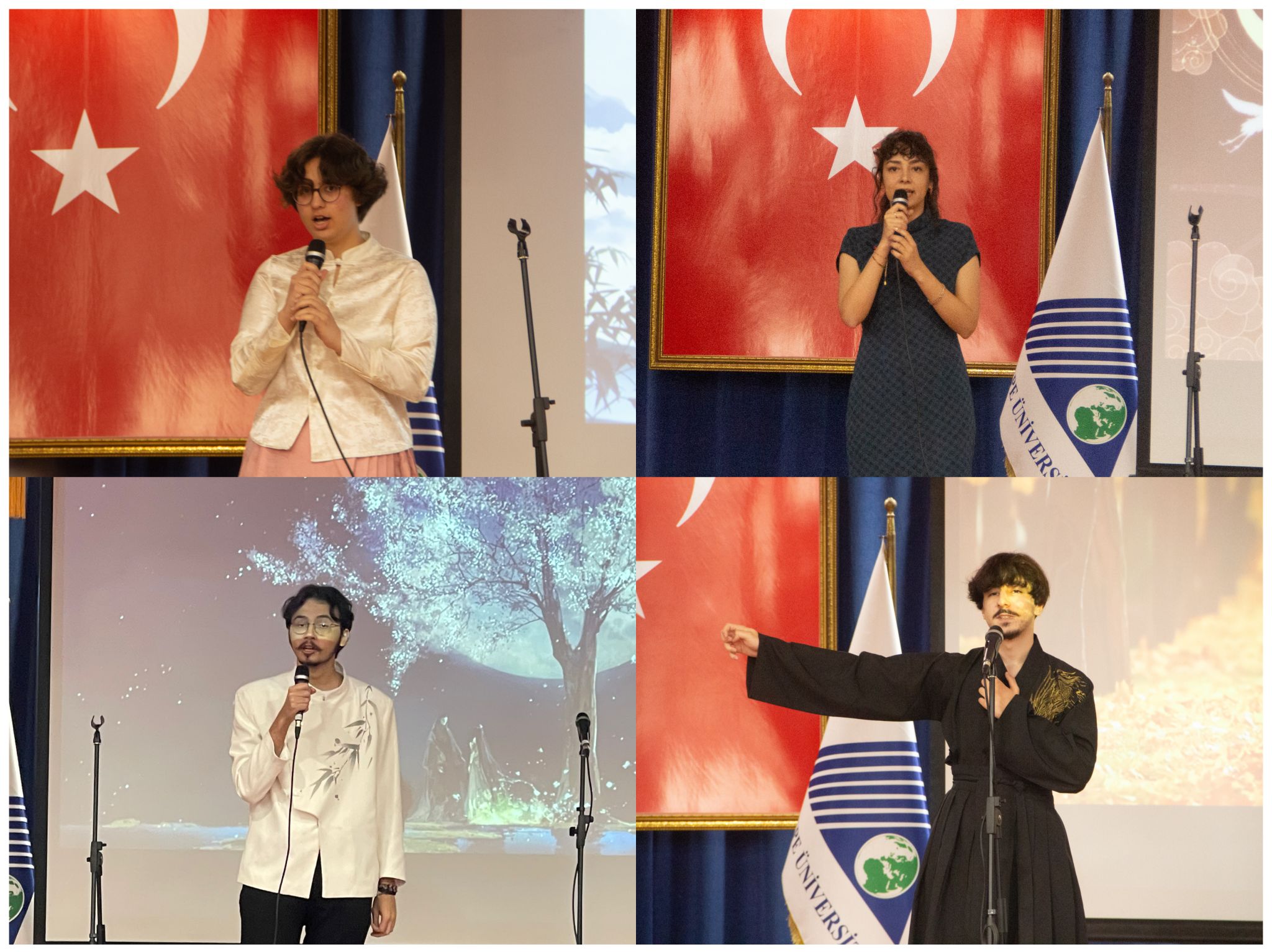 在中华诗词朗诵比赛中,乌云(Eren Berk Karabulut)以一首气势磅礴的《沁园春·雪》荣获一等奖;谢怡达(Şeyda Temel)同学以深情款款的《乡愁》获得二等奖;玖月(Fatma Kışlal)同学深情朗诵《我爱你,中国》,获得三等奖;阿力(Ali Tarık Birsoy)同学的《再别康桥》,让人身临其境,获得优秀奖。在中文歌曲卡拉OK比赛中,张克雅(Zekeriya Kocabaş)同学用活泼风趣的《对面的女孩看过来》赢得一等奖;林佳(Fatma Doğan )同学演唱《如愿》,情真意切,荣获三等奖;乌牧特(Umut Keleş)与 苏德(Sude Nur Aydın)两位同学合唱《没有理由》,表现默契,双双荣获优秀奖。