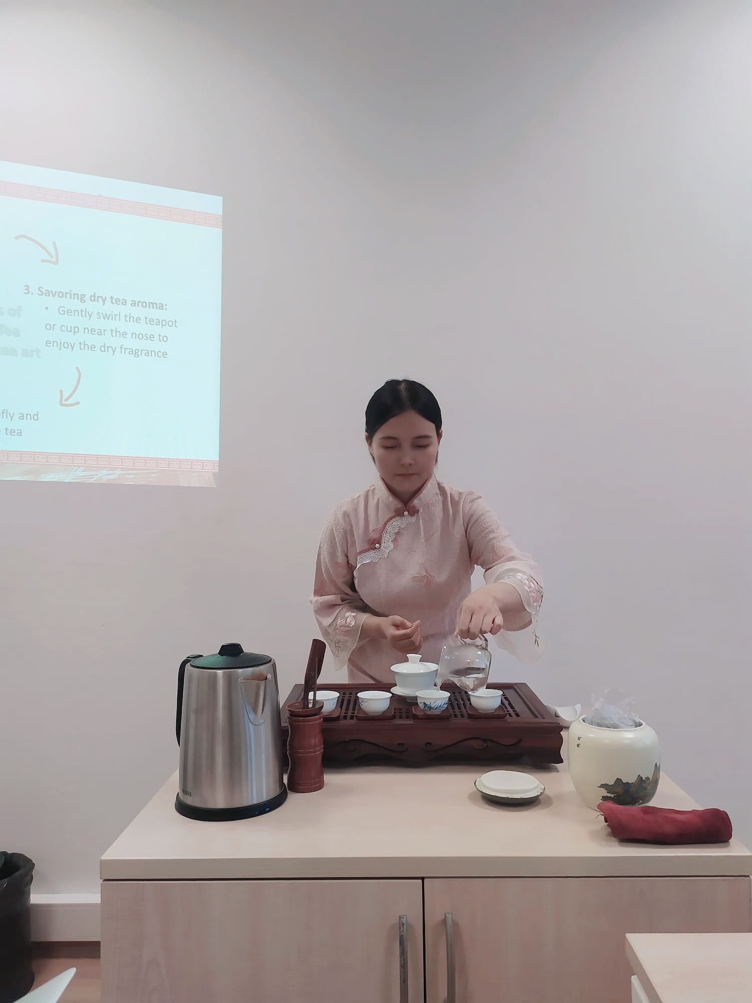 紧接着,袁沛云老师为大家带来了茶文化分享。从中国茶文化的发展历程、不同茶类的特点,到茶艺器具的种类及使用方法,袁沛云讲解介绍并结合实物进行展示,让学生们对茶文化有了直观了解。在茶艺展示环节,袁沛云演示了泡茶、闻香、品茶的全过程,学生们不仅被茶香和茶艺的优雅深深吸引,还在引导下亲手尝试泡茶,每一步都体验到了品茶背后蕴含的宁静与和谐。