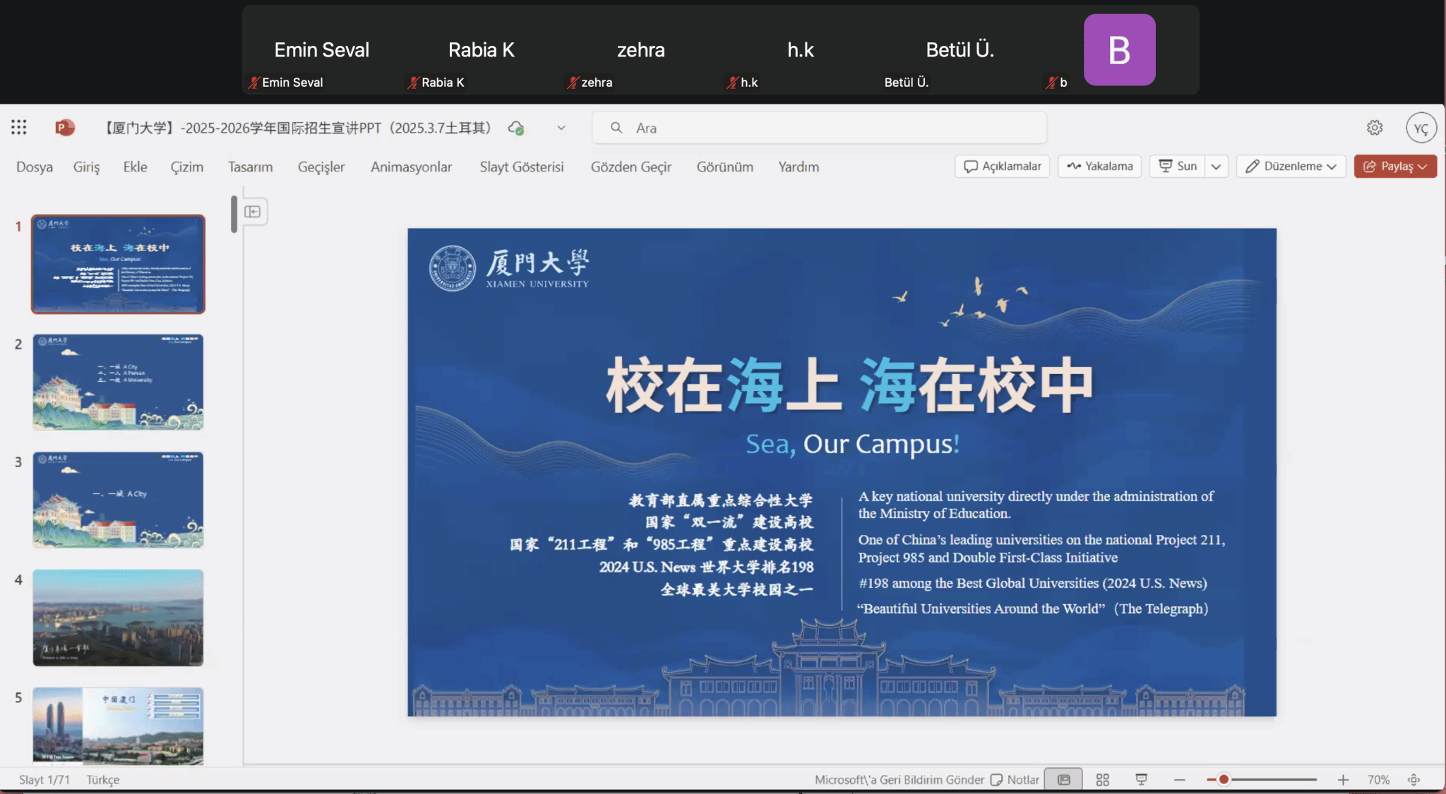 当地时间10月3日,土耳其中东技术大学孔子学院成功举办2025年度秋季学期“国际中文教师奖学金”暨“厦门大学奖学金”专题宣讲会。本次宣讲由孔院志愿者学生爱英(Ayperi Öztürk)主讲,以线上形式面向全国9所大学及中文机构同步开展。参与本次宣讲的大学和机构包括:中东技术大学、安卡拉大学、哈之巴以拉姆大学、比尔肯特大学、安卡拉社会科学大学、伊斯坦布尔大学、埃尔基耶斯大学、内夫谢希尔大学及土中文化协会,共吸引180名学生线上参会。