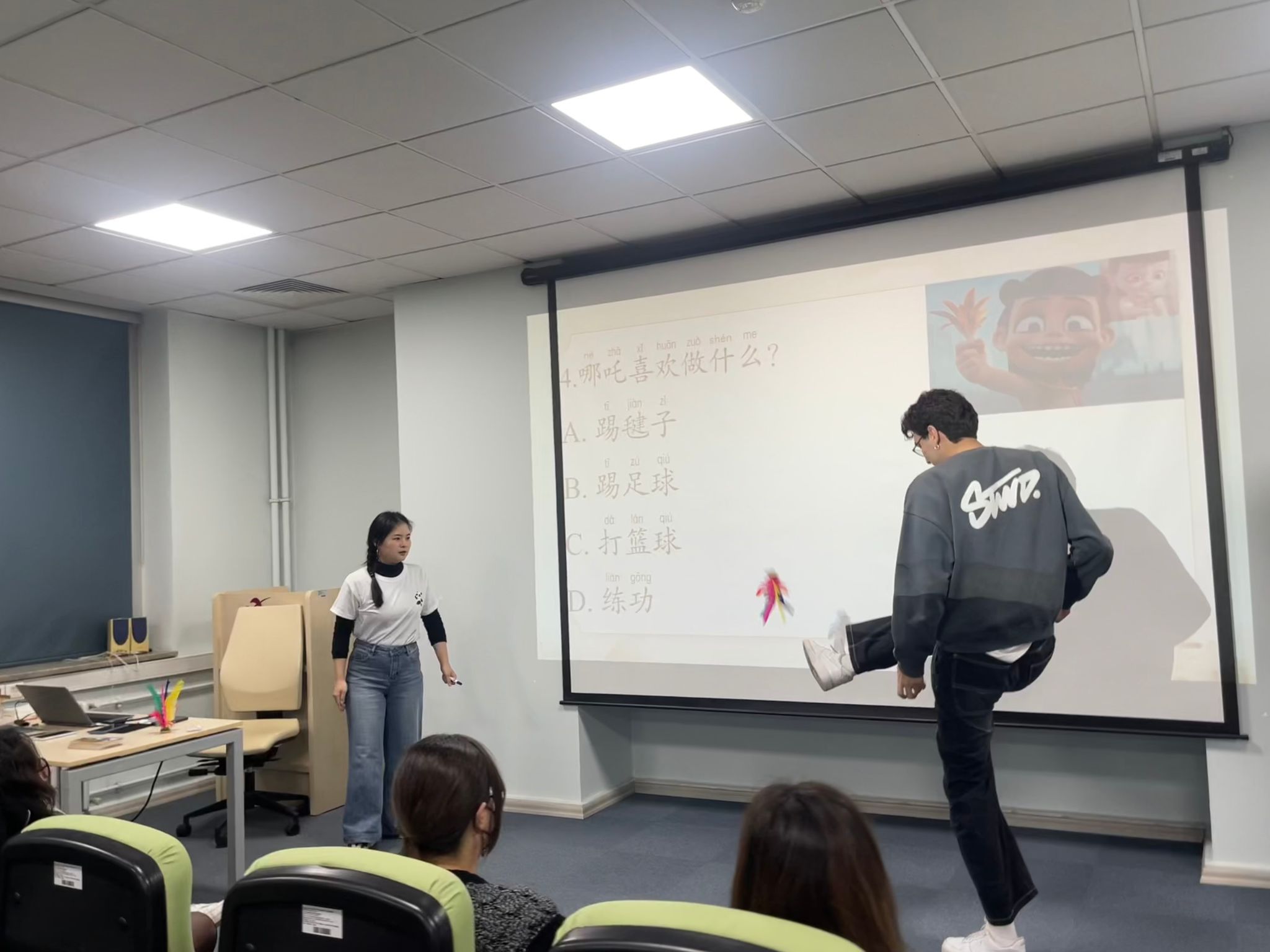 观影后的互动环节精彩纷呈。有奖问答中,同学们积极用中文抢答;当提及贯穿影片的重要纽带 “踢毽子” 时,有学生自告奋勇上台演示,并组织了一场趣味踢毽子比拼。五彩的毽子在空中飞舞,台下掌声不断。