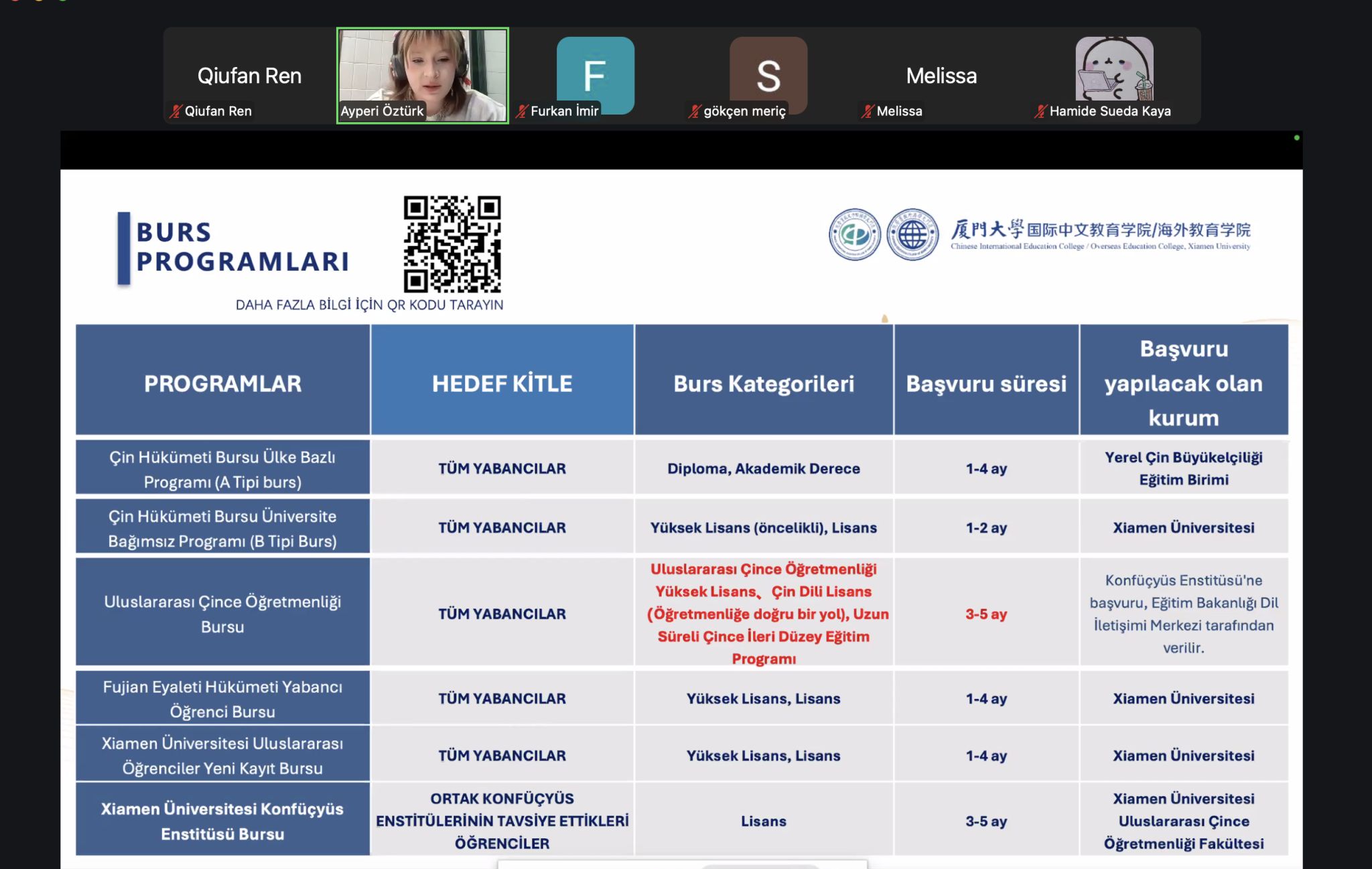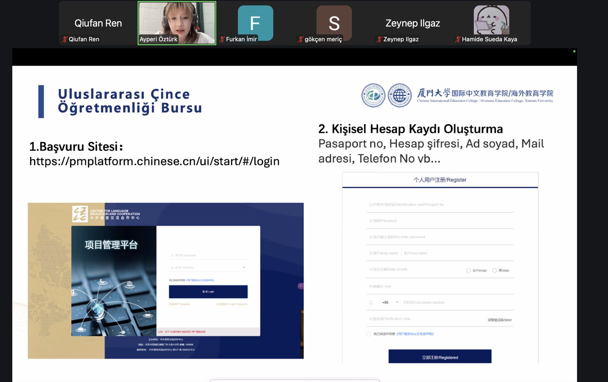 本次宣讲会邀请到中东技术大学孔子学院志愿者学生爱英(Ayperi Öztürk)担任主讲人。爱英已获得中国政府奖学金,目前正在北京语言大学攻读硕士学位。宣讲中,她结合自身奖学金申请经历以及在中国的学习与生活体验,为同学们详细分享了申请过程中的准备要点和个人建议,帮助有意赴华留学的学生更加清晰地了解申请流程。