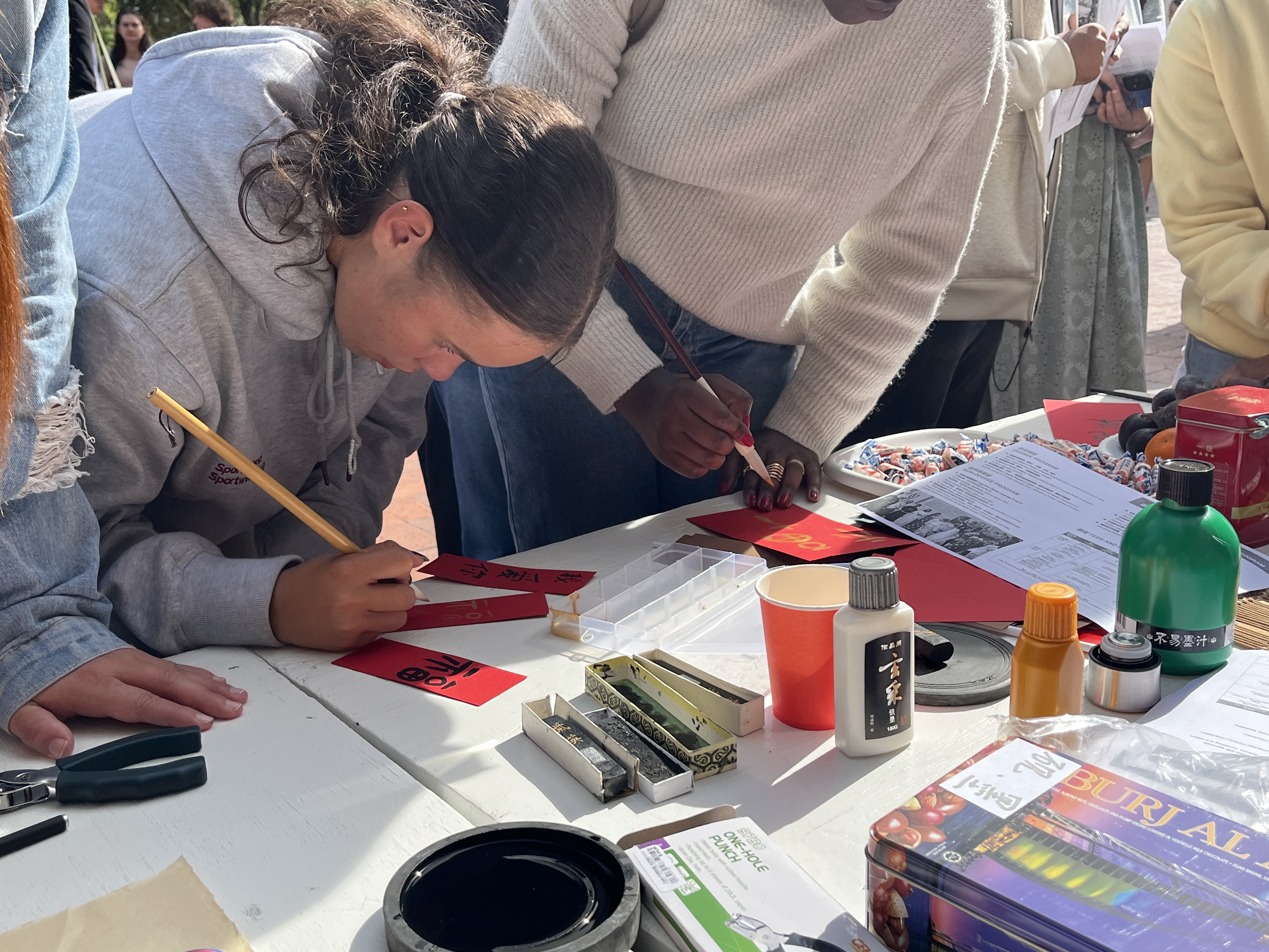 挥毫泼墨展神韵,气韵生动显儒风。活动现场,孔院刘瑜老师为学生们讲解中国书法的历史,展示中国的笔墨纸砚,使用砚台磨墨,示范书法写作。学生们可以用毛笔在书签上写下自己喜欢的汉字,并带走自制的“书法书签”留作纪念。学生们排着队请刘老师给自己起中文名字,争先恐后地尝试用毛笔写汉字。“书法书签”极大地激发了学生们对汉字文化的兴趣,也让学生们认识到了中国书法文化的博大精深。