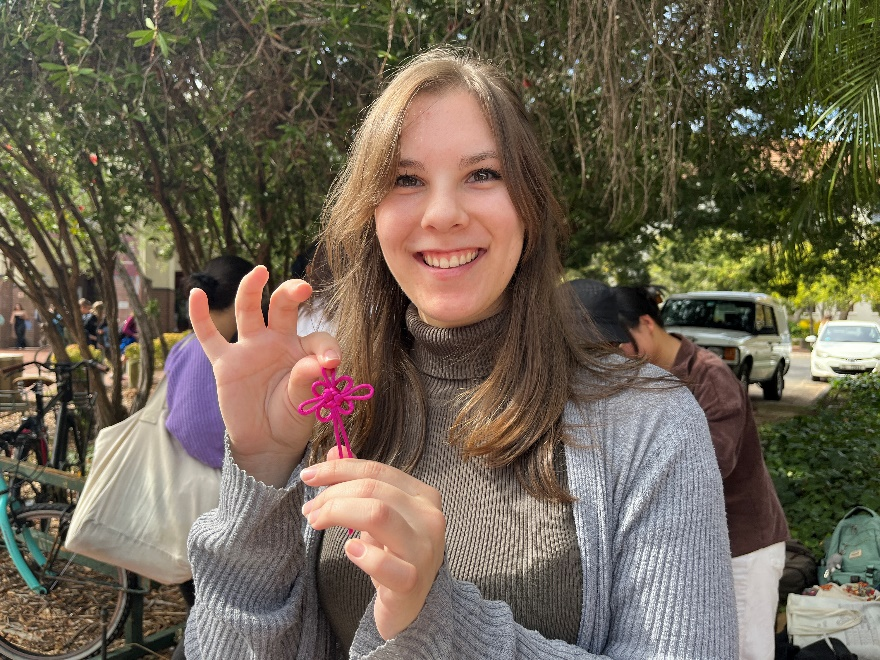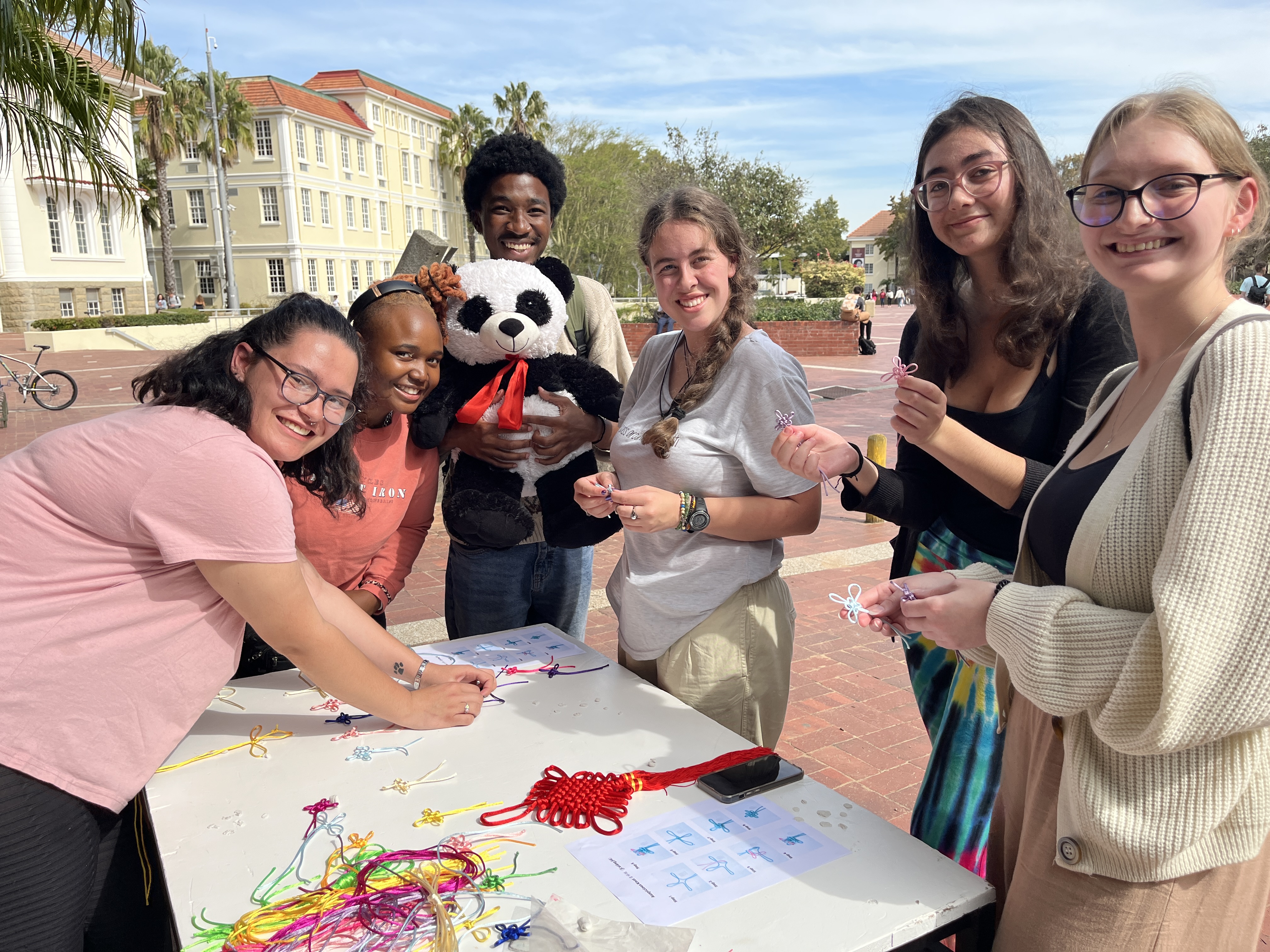 五彩红绸编福缘,千结万结系心田。中国结是中国传统的手工编织工艺品,是中国家庭最重要的装饰品之一。活动现场,学生们在孔院志愿者徐梦轩的指导下,亲手编织“小中国结” ——“吉祥结”。徐老师告诉学生们,中国结象征着人与人之间和谐美好的情感联结,传递着吉祥和祝福,学生们纷纷表示十分喜欢中国结的寓意,而且中国结像一朵美丽的花,立刻将自己制作的“小中国结”挂在了身上、书包上。