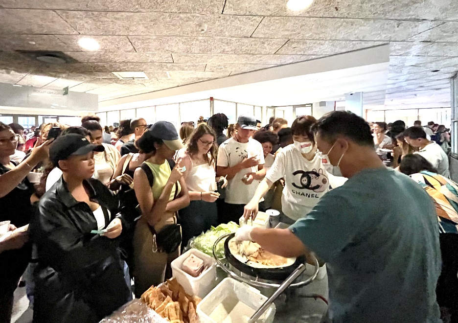 美食节现场有巴西、法国、日本等几十个国家的美食摊位。活动持续了两个半小时,在此期间,孔院的中国美食摊位前始终挤满了人,排队人数只增不减。