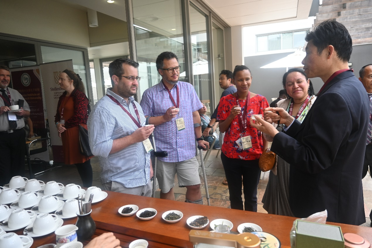 庆典大会安排了半个多小时,播放了厦大和斯大孔院的宣传视频,吸引了众多来宾观看,提升来宾对厦大和孔院的认知与形象。此外,西开普大学中医孔院的中方院长曾立人教授、林琳老师和杨航老师友情帮助我们设置了一个喝中国茶的体验点,给来宾们讲解中国的茶文化并进行了茶艺表演,大家饶有兴致地聆听并体验中国茶的芳香与艺术,频频发出啧啧的称赞声和笑声。