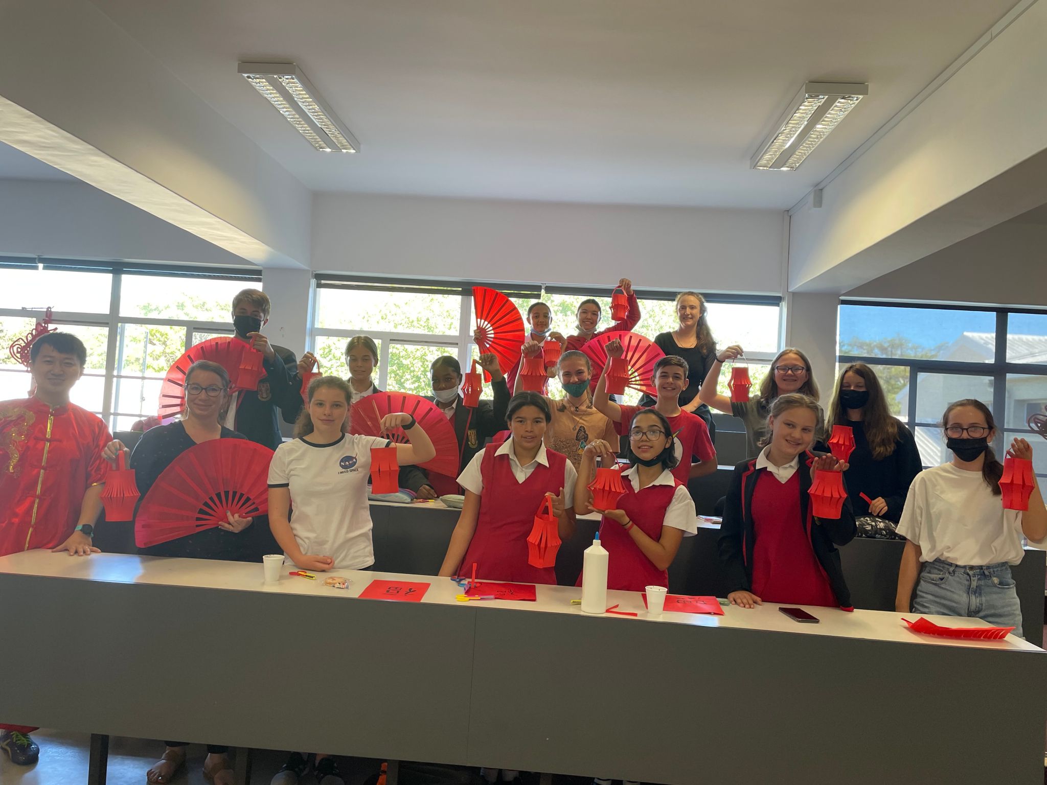 以下图片是在孔子学院教学点斯坦陵布什高中举办的写“福”字、制作灯笼和打太极扇等中国文化系列体验活动剪影。