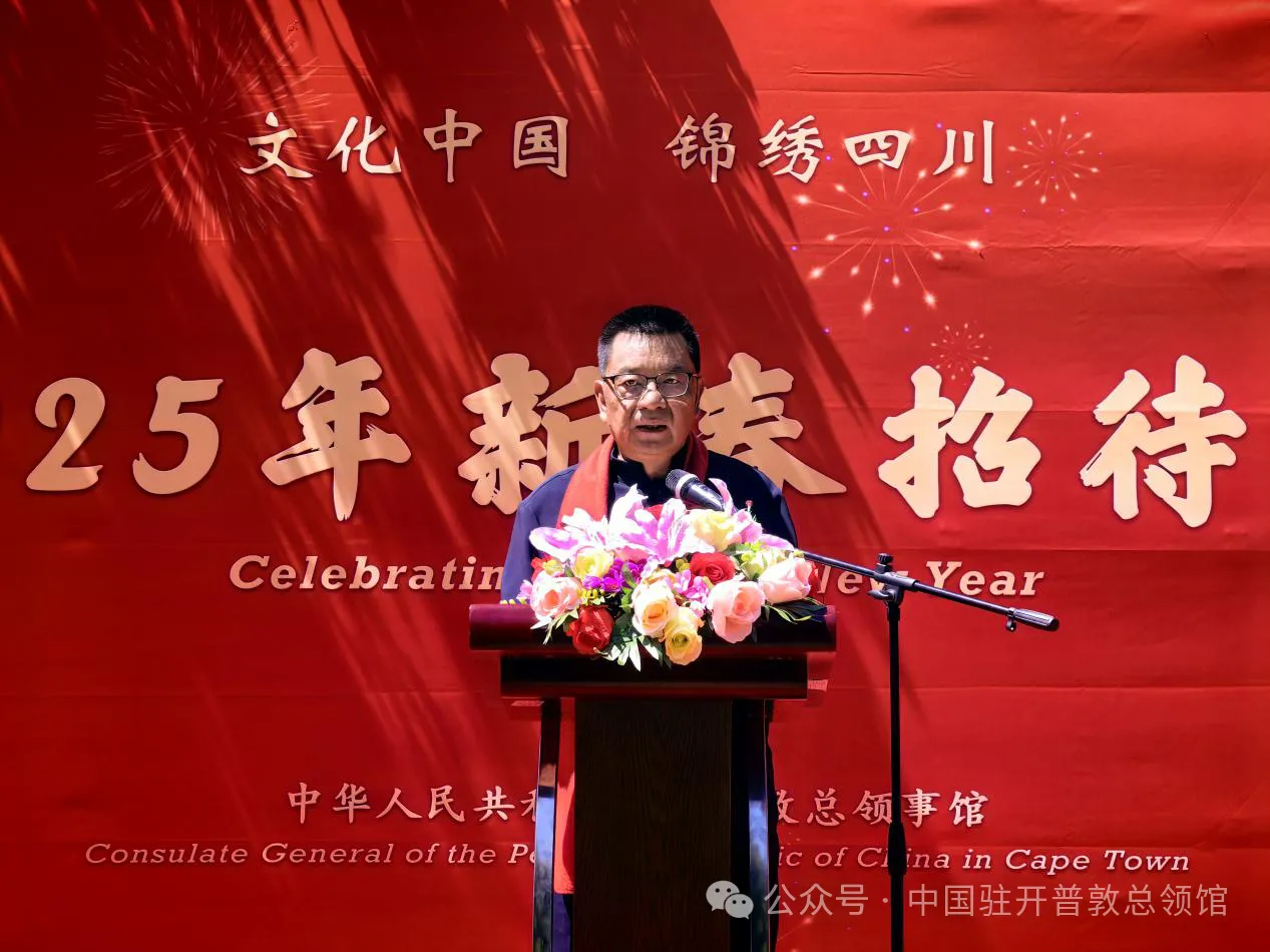 祥狮献瑞,恭贺新春。开普敦华星艺术团带来的舞狮表演为招待会拉开了序幕,生动活泼的狮子在锣鼓声中嬉戏翻腾,洋溢着节日的欢庆气息,将现场气氛瞬间点燃。随后,中国驻开普敦总领事尤文泽向全体与会嘉宾表达诚挚的问候和美好的新春祝福。