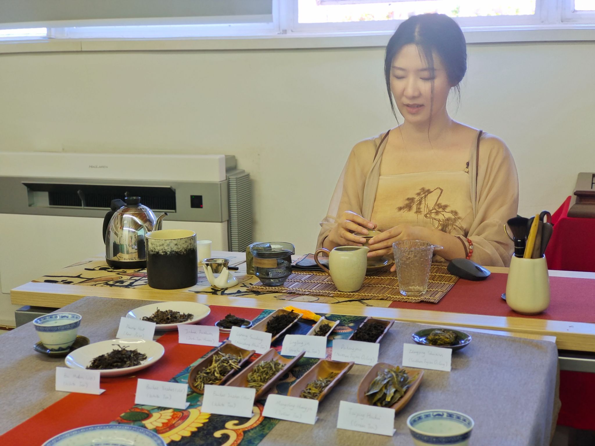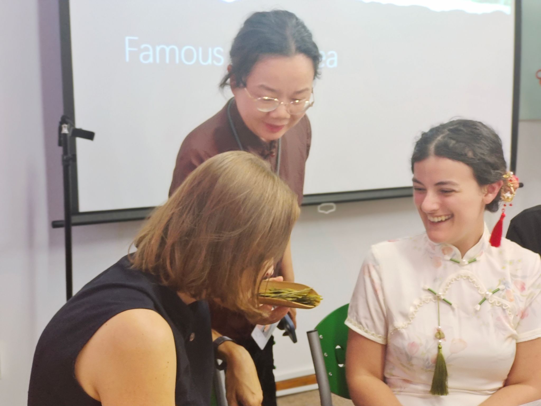 张怡老师作为此次活动的主讲人,从茶文化的历史讲起,她简单介绍了中国茶文化的内涵与重要性,随后温杯烫盏,为大家依次讲解并演示六大茶类的特点与冲泡方式。通过玻璃杯冲泡绿茶、紫砂壶冲泡乌龙茶与黑茶、盖碗泡白茶、黄茶和红茶,张怡老师为大家展示了茶艺的精妙与茶汤的独特口感。大家闻茶香、品茶汤、观茶底、谈茶道,现场气氛活跃,反响热烈,参与者表示,之前从未意识到茶的种类如此丰富,也没想到茶的味道竟如此多样,激发了他们对中国茶的浓厚兴趣。