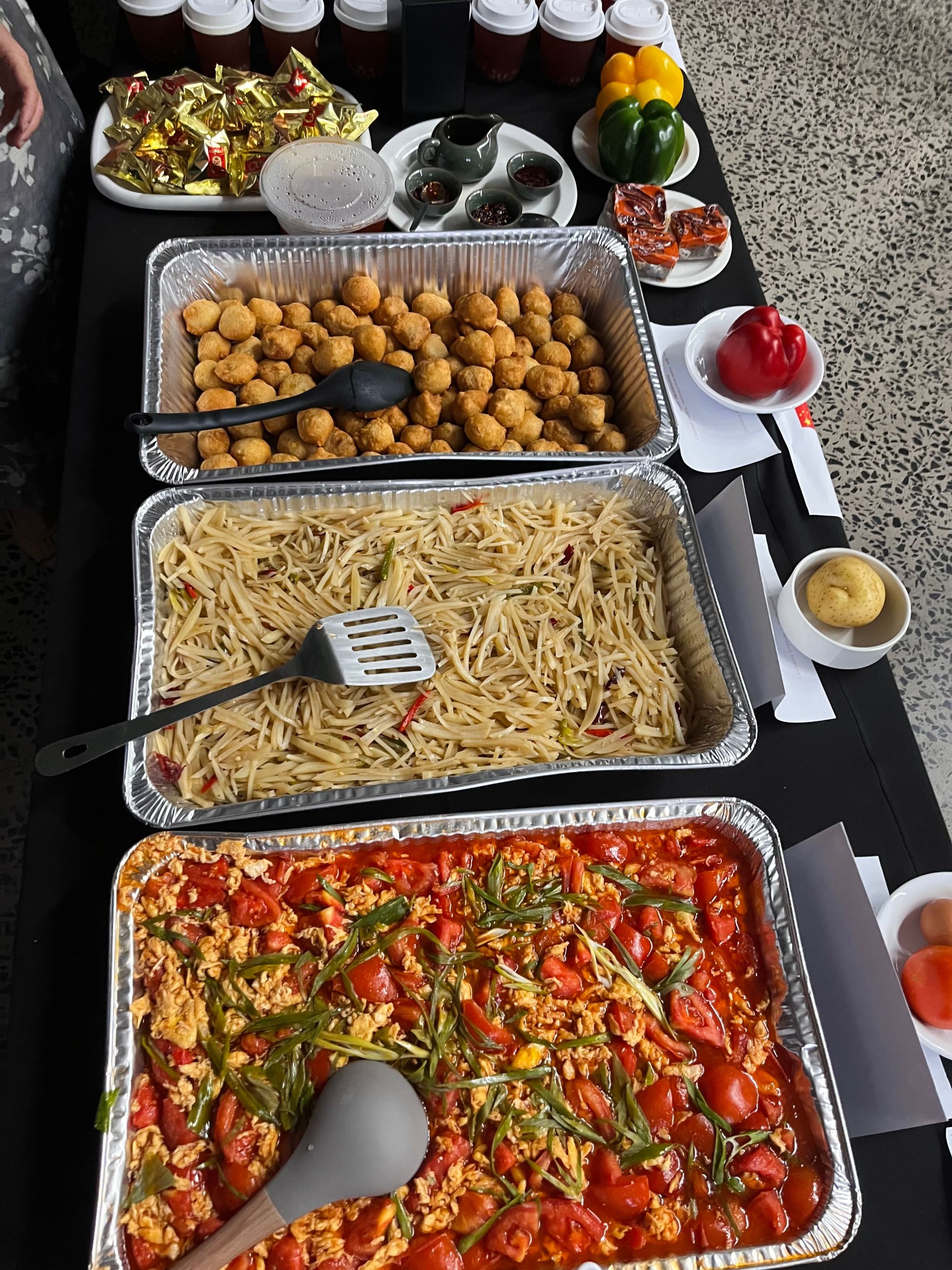 美食节伊始,孔子学院的展位便人潮涌动,三道精心挑选的中国家常菜——西红柿炒鸡蛋、酸辣土豆丝和咕噜肉,配上清香四溢、软糯可口的白米饭,引得师生们纷纷驻足购买、品尝。这些菜品不仅色香味俱全,更承载着浓厚的中华饮食文化底蕴。西红柿炒鸡蛋以其金黄透红的诱人色泽、鲜嫩多汁的口感赢得了师生们的交口称赞;酸辣土豆丝则以其独特的酸爽与脆嫩带来别样的味蕾冲击,让不少初次品尝的外国朋友直呼“惊艳”;而酸甜适口、外酥里嫩的咕噜肉更是大受欢迎,成为了当晚的“明星菜品”。