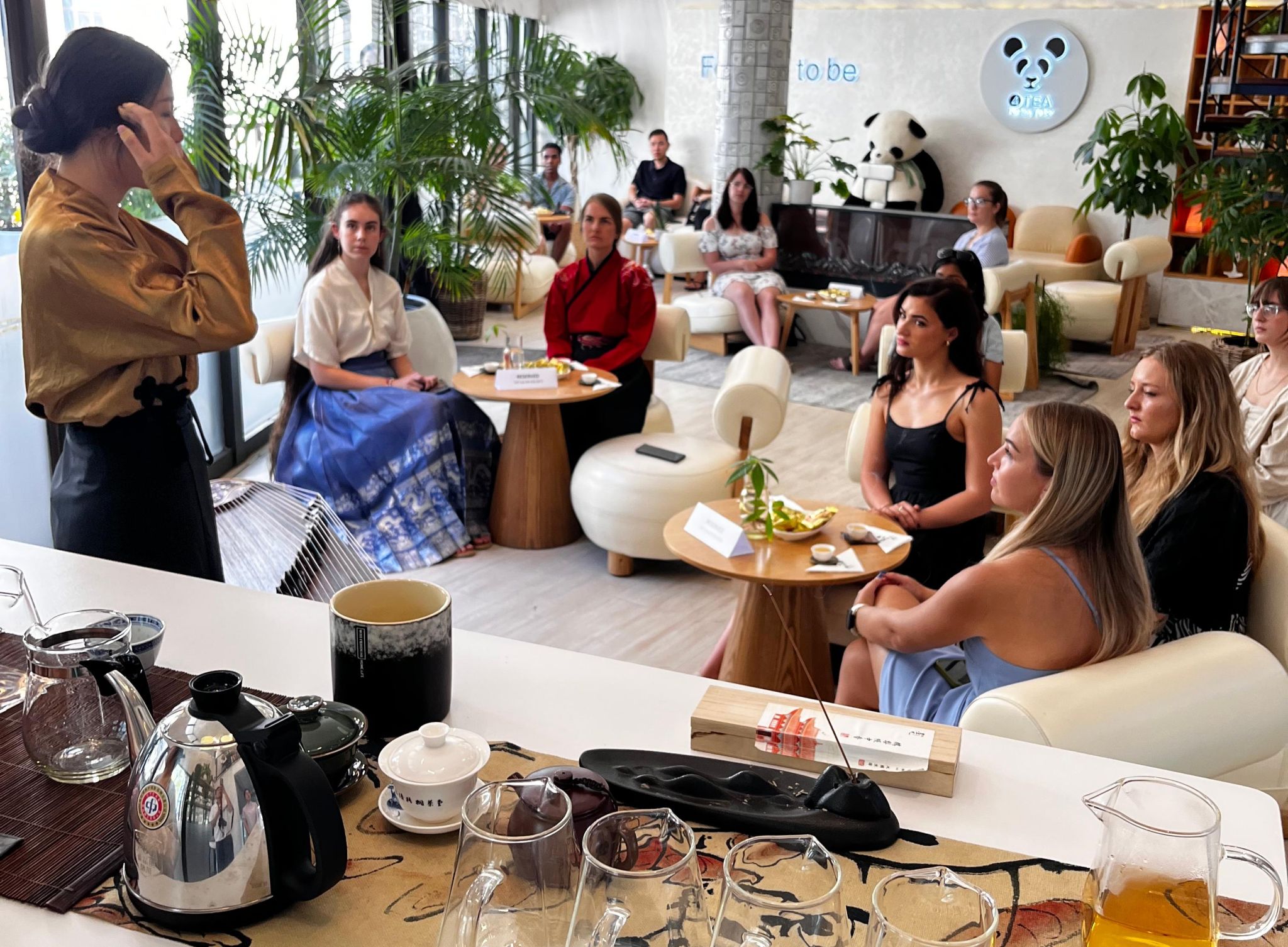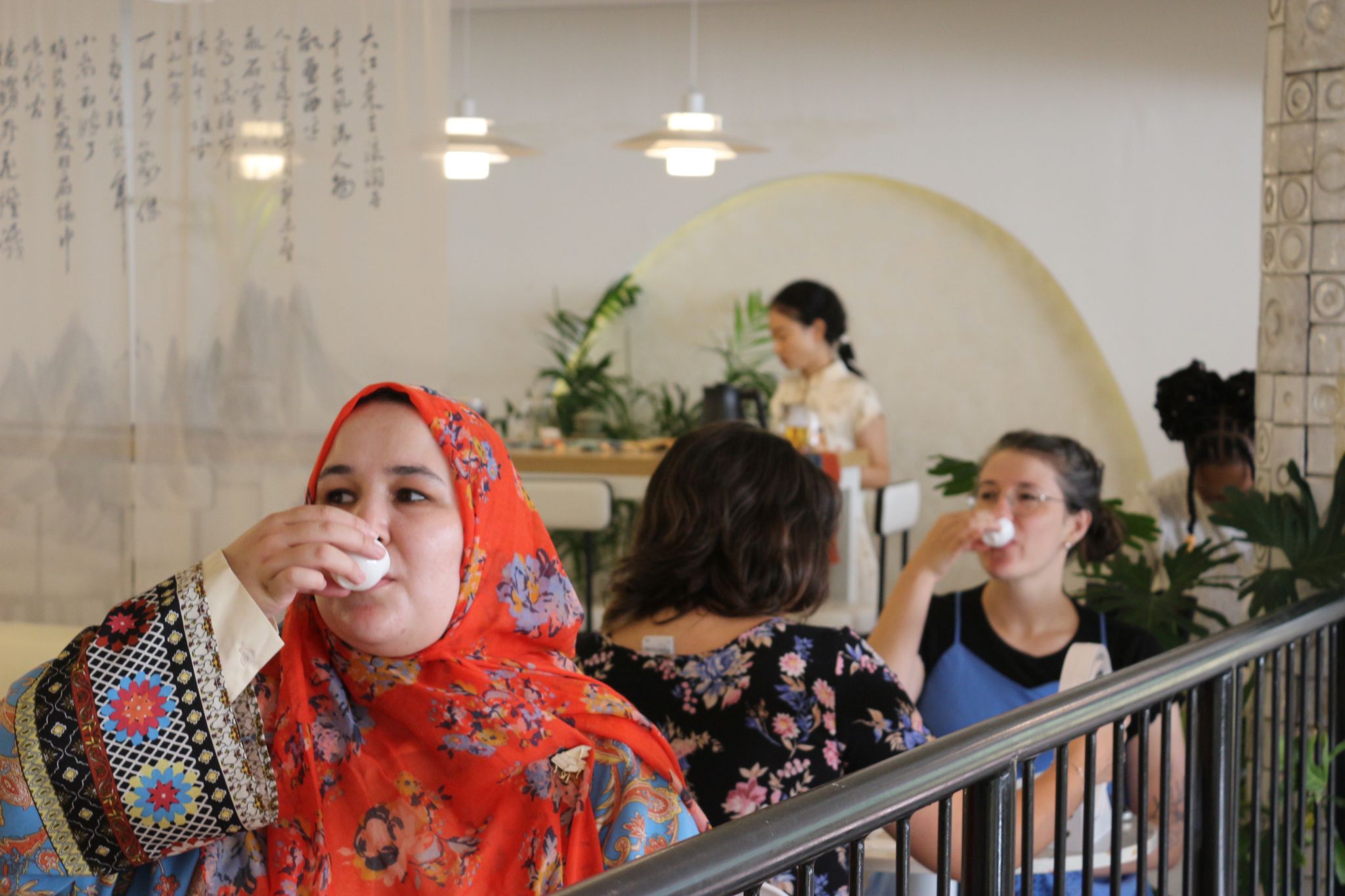 音乐沙龙间隙,孔子学院特别安排了茶艺品鉴环节。余小容、周婧宸两位老师的精彩表演,为嘉宾们开启了一段茶文化之旅。现场准备了四款经典中国茶:清雅的西湖龙井、芬芳的茉莉花茶、烟香醇厚的正山小种和岩韵悠长的武夷岩茶。在氤氲茶香中,嘉宾们细细品味,不仅领略了中国茶的独特风味,更感受到其中蕴含的礼仪文化与生活智慧。活动结束后,多位来宾赞叹这是一次难忘的文化体验:既欣赏到传统音乐之美,又通过品茶体会到中国人"以茶会友、以茶静心"的生活哲学。