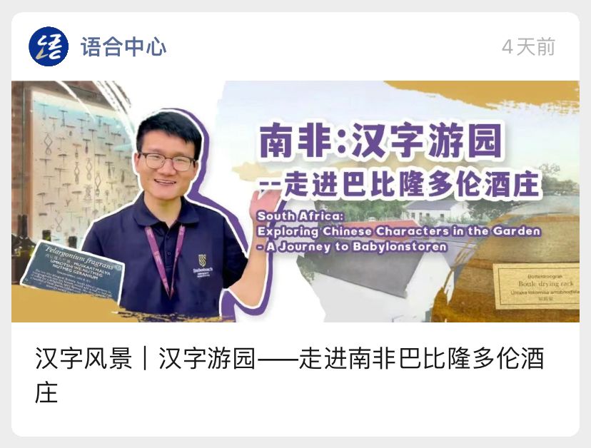 当地时间5月2日,由南非斯坦陵布什大学孔子学院团队制作的短视频《汉字游园-巴比隆多伦酒庄》在教育部中外语言交流合作中心官方微信公众号和视频号上播出。