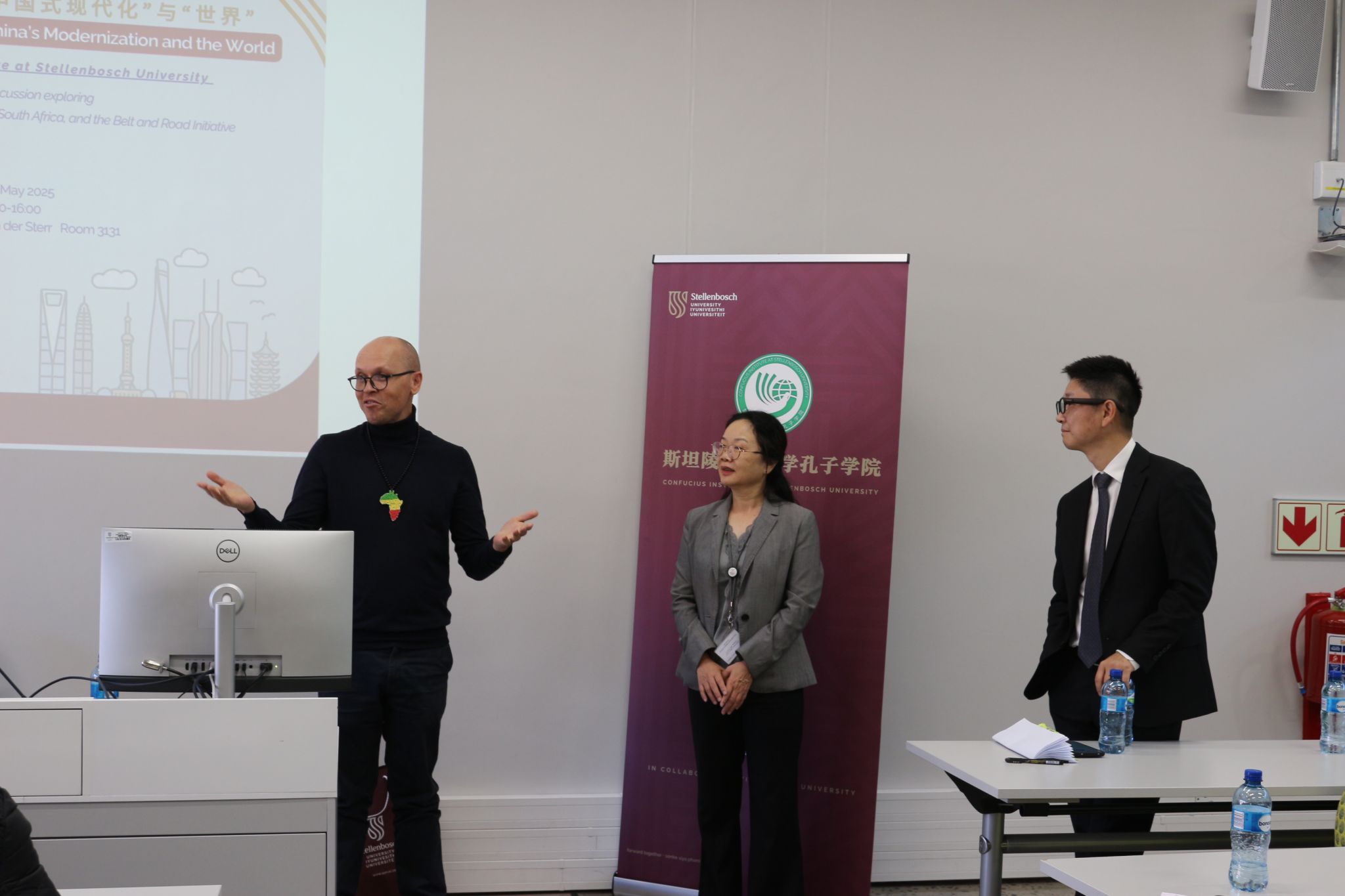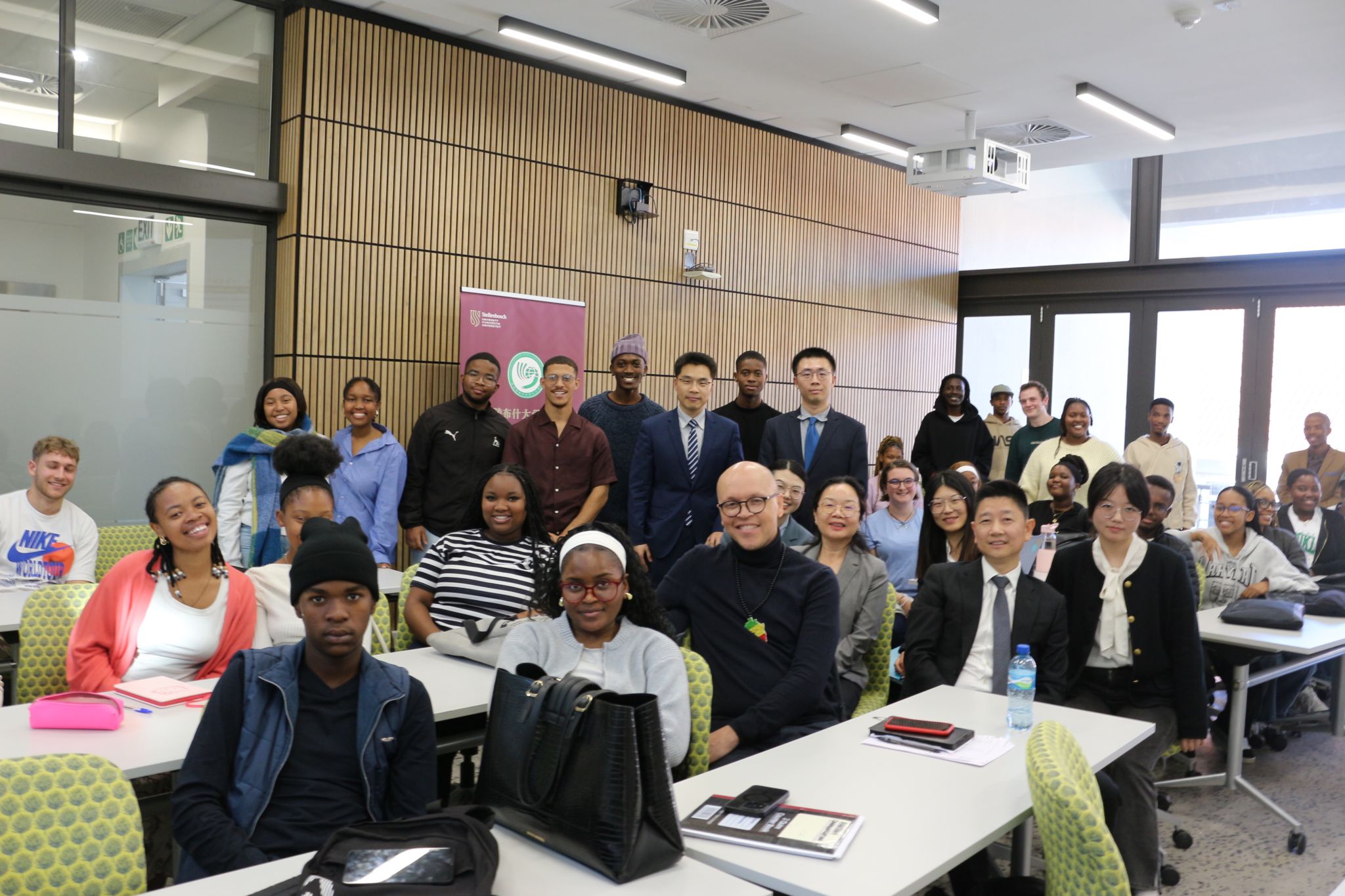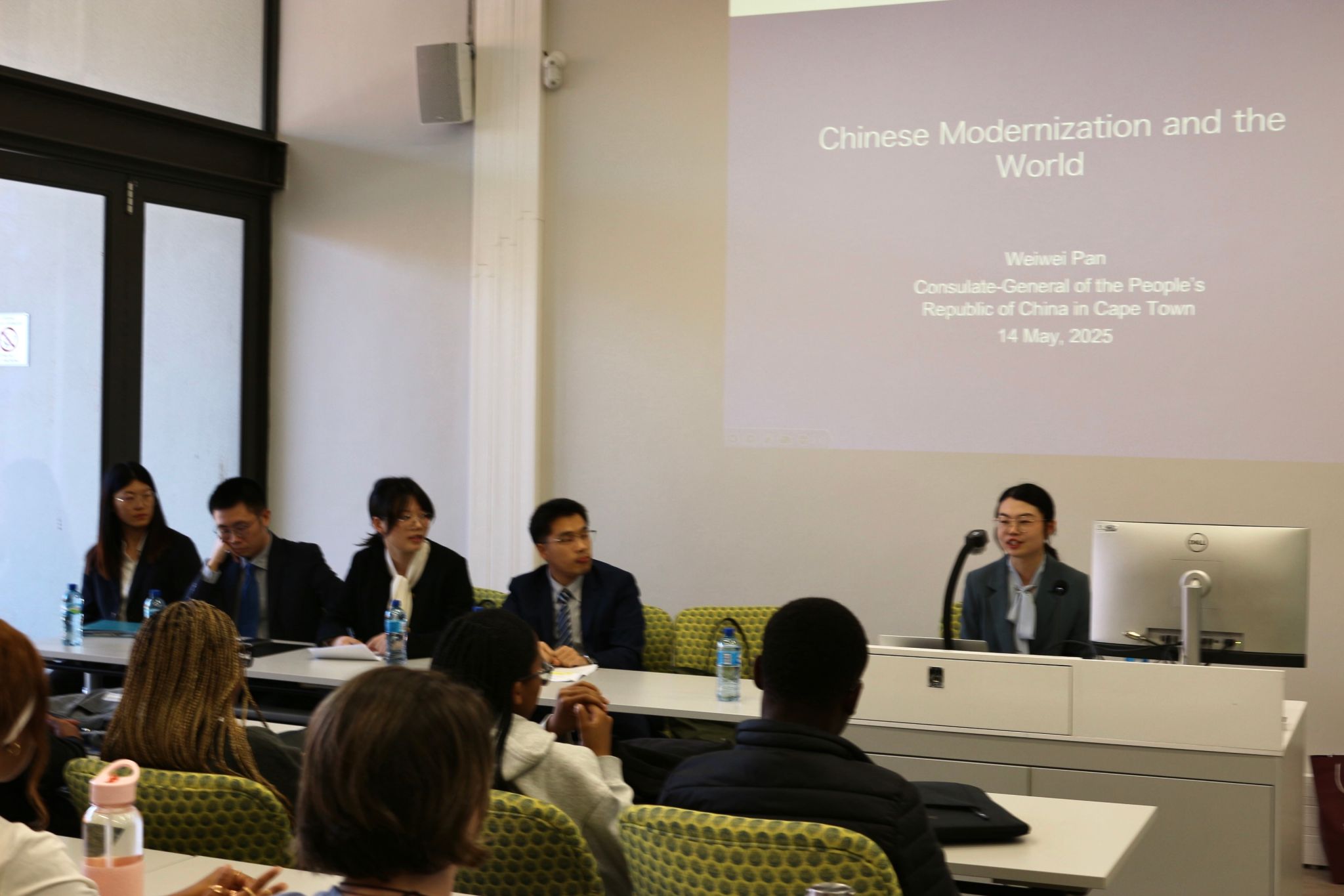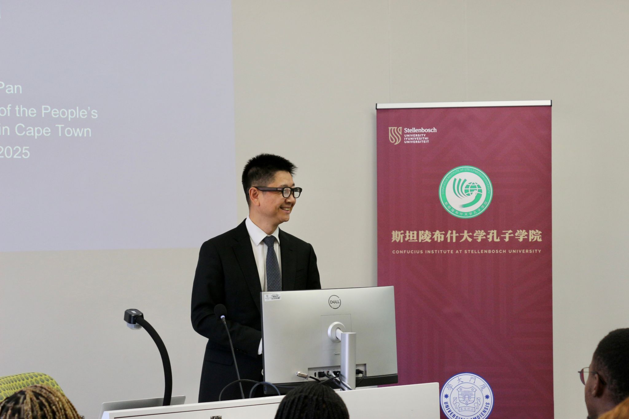 讲座由孔子学院中方院长郑若娟主持。她在开场致辞中表示,中国的发展经验以及对世界和平与共同繁荣的承诺,对于年轻一代未来领导者有着重要的启发意义。中国驻开普敦总领馆副总领事汤长安在开幕致辞中强调,中国式现代化不仅是中国自身发展的战略选择,更是致力于与世界共享发展成果的重要路径,中非之间的合作正是全球南方国家互助共赢的典范。