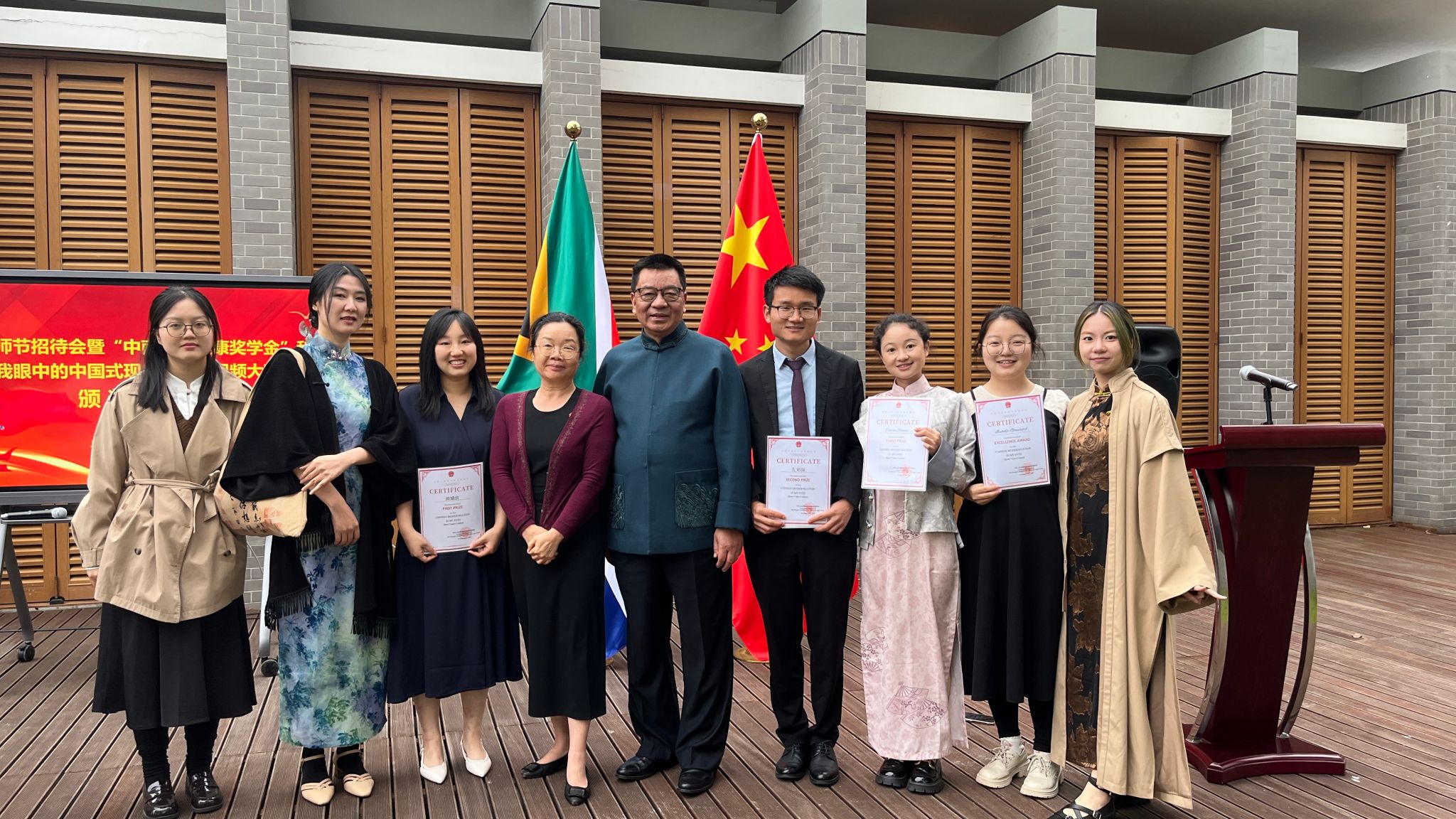 颁奖仪式上,尤文泽总领事亲自为一等奖获得者利亚姆和周婧宸颁奖并合影留念。他强调,希望大家有机会多去中国走一走、看一看,加深对华认知和理解,把一个真实、立体、全面的中国介绍给更多南非朋友,共同促进中南友好交流与合作。利亚姆作为获奖代表发表感言时动情地说:“这不仅是一份荣誉,更是继续了解中国、传播中国故事的动力!”