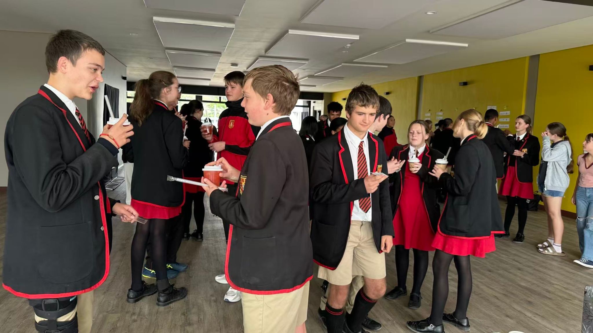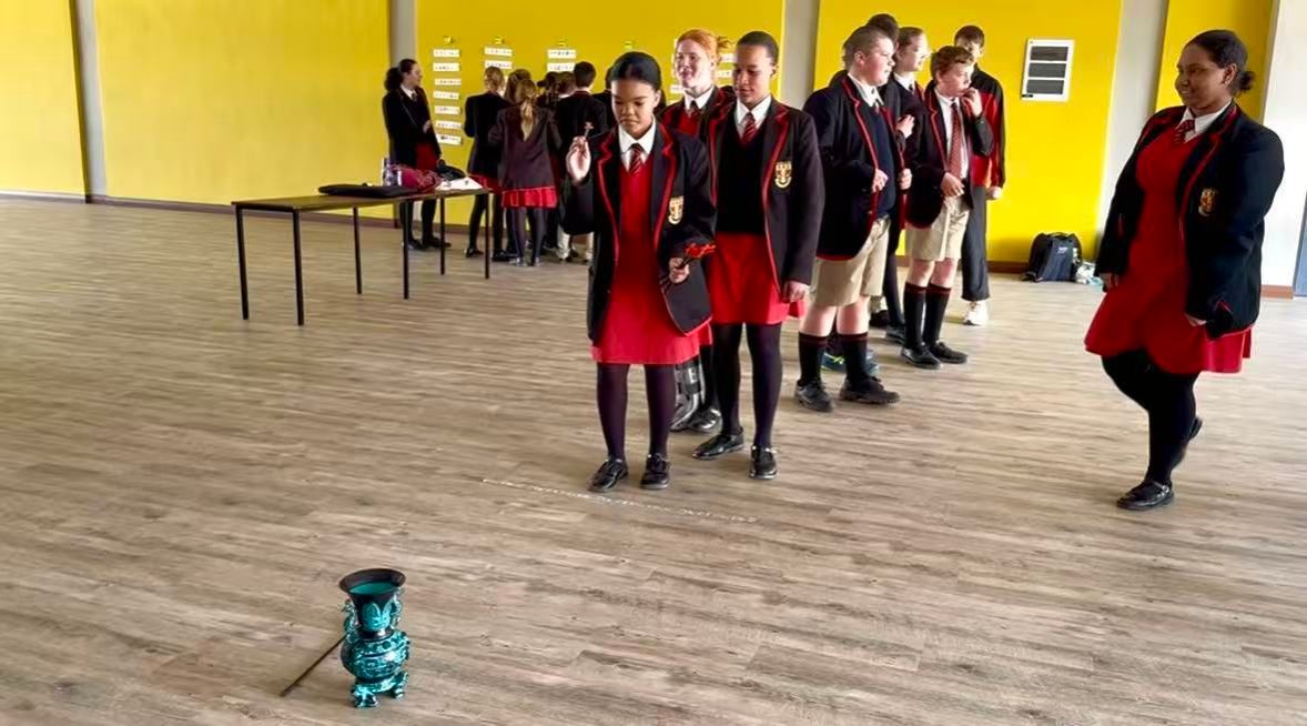 在“识汉字、写汉字”之余,4TEA为斯坦陵布什中学的师生们准备了来自中国的奶茶。学生们一边品尝香浓奶茶,一边参与投壶游戏。一只只箭矢接连落入壶中,现场笑声与掌声此起彼伏,既展现了古人雅趣,也让学生们在轻松氛围中感受到中国传统礼仪文化的魅力。