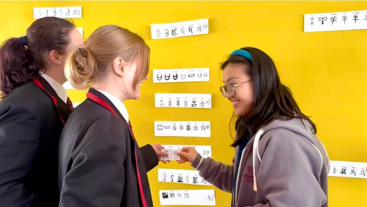 本次活动的最大亮点是“汉字探源”游戏。汉字作为世界上最古老的文字体系之一,不仅是记录历史的重要载体,也是中华文明延续至今的独特符号。现场布置的“汉字长廊”,展示了甲骨文、金文、小篆、隶书到现代简化字的演变。学生们在对比中推测字义,并与现代字形匹配,仿佛踏上一段跨越时空的文化之旅。许多学生惊喜地发现古代汉字的象形特征,如“日”似太阳,“马”显鬃毛与四足。”看到古代的‘鱼’字,我一眼就猜出来了,真的太像了!”学生安莉·奥伯霍尔泽(Anli Oberholzer)兴奋地说道。斯坦陵布什中学负责人马连卡·克里格(Marenka Krige)老师评价:“通过这样直观的互动游戏,学生不仅增强了对汉字的兴趣,更体会到汉字背后深厚的文化底蕴。这种寓教于乐的形式非常适合在中学推广。”