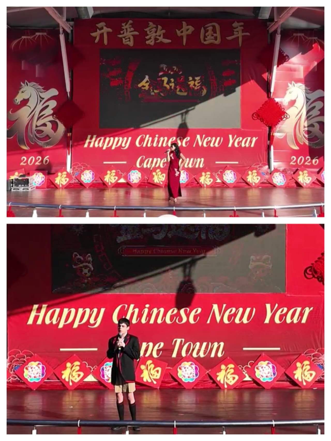 歌声飞扬,情动新春。在文艺演出环节,斯大孔院学生小爱(Ashiquah Norodien)献唱歌曲《火红的萨日朗》,热情洋溢的旋律点燃了现场气氛;学生斯特凡·普林斯(Stefan Prins)深情演绎经典作品《水调歌头》,将中国古典诗词之美娓娓道来,赢得观众阵阵掌声,充分展现了南非中文学习者对中国语言与文化的理解与热爱。