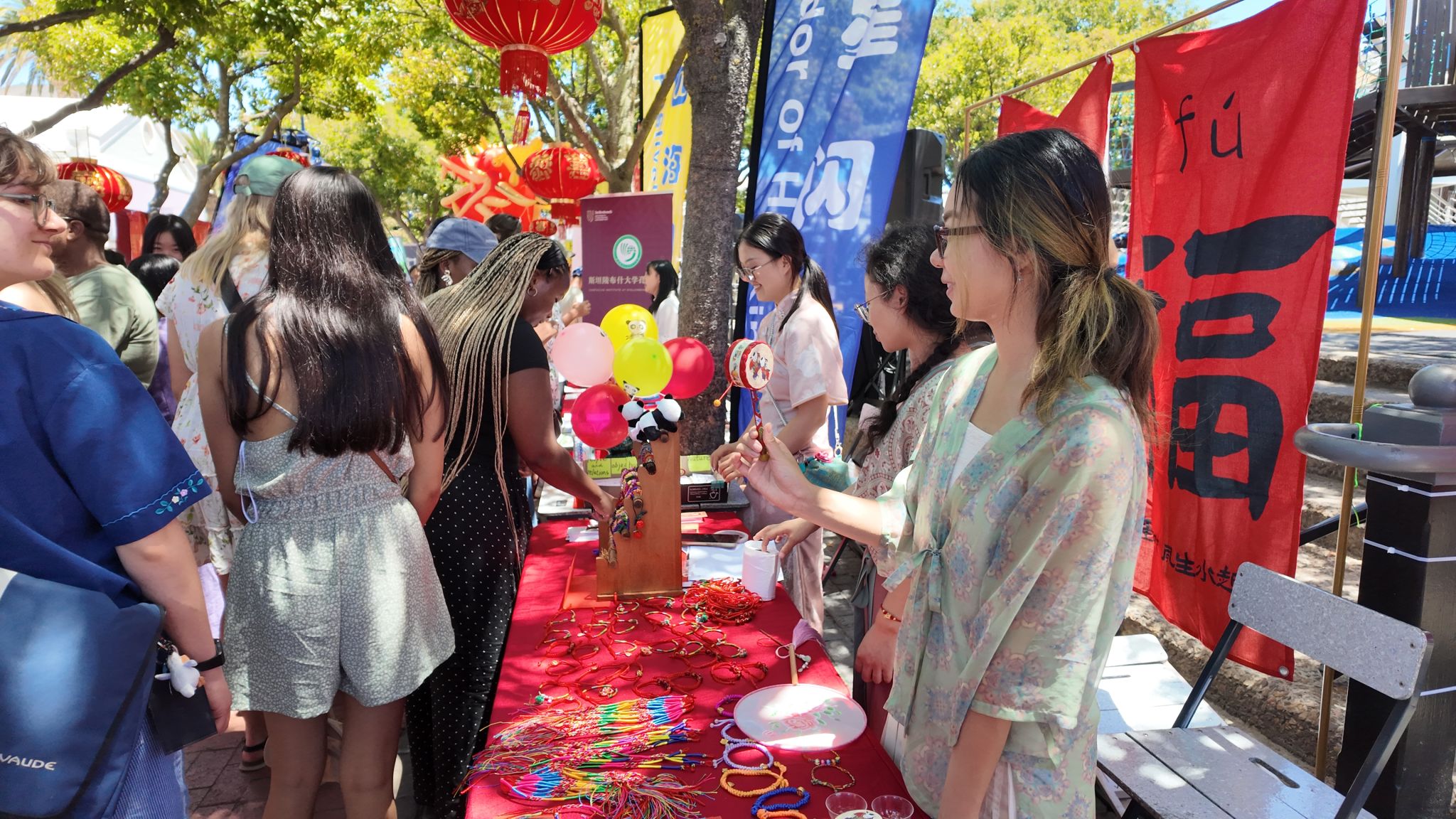 活动现场年味浓郁,大红灯笼高高悬挂,福字与中国结装点其间,洋溢着喜庆祥和的节日氛围。斯大孔院精心布置中华文化体验展区,内容丰富、互动性强,吸引了众多家庭与青少年驻足参与。此次孔院围绕中国传统生活与礼俗文化,设置了品茗、结绳、五子棋、汉服体验及汉字猜谜等互动项目,让参与者在轻松愉快的氛围中近距离感受中华传统文化的独特魅力。
