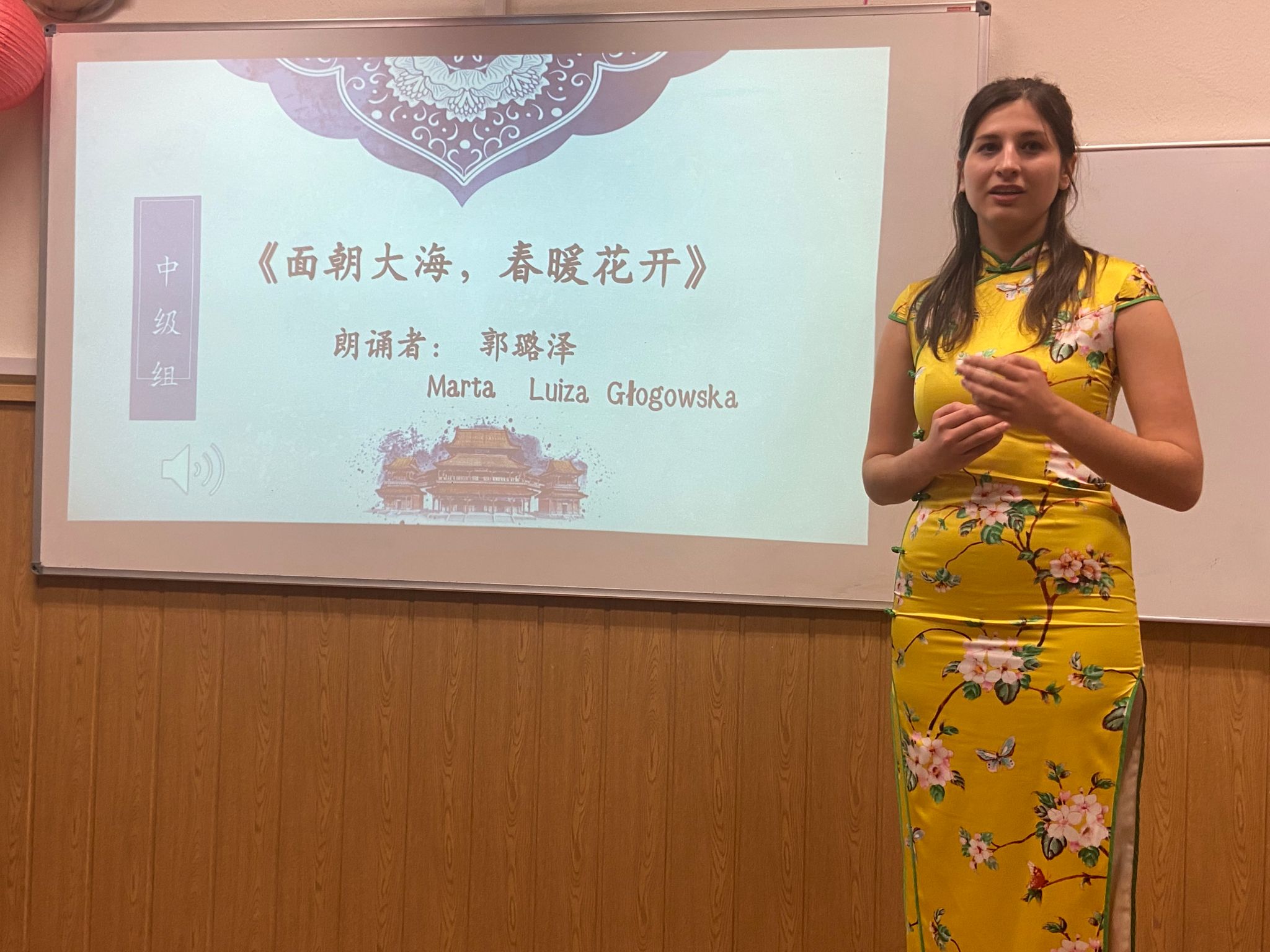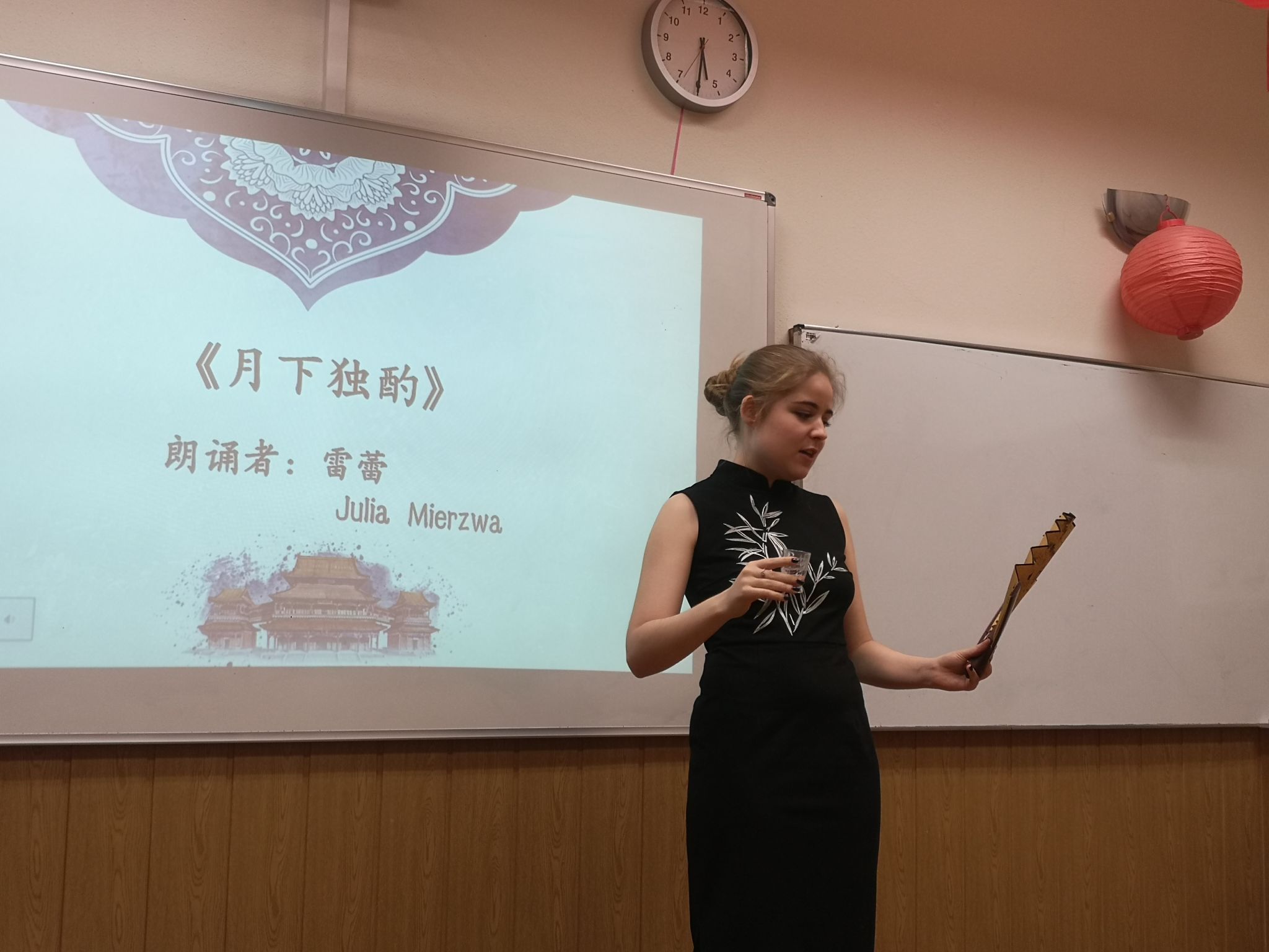 比赛前,孔子学院的老师、志愿者们对选手进行精心辅导,学生们的朗读水平取得明显提升。比赛过程中,同学们盛装打扮,自信满满。室外下着大雪,室内师生们激情高昂。由于是线下比赛,不少学生在自己的朗诵表演中增加了丰富的表情动作,尤其是初级组的古诗朗诵,有的学生还使用了道具。朗诵《月下独酌》的参赛者准备了酒杯、古书、台灯等等,雷蕾(Julia Mierzwa)同学在朗诵结尾处将杯中的伏特加一饮而尽,向观众们展示了女版“诗仙”。在中级组的比赛中,大家聆听了浪漫悲伤的诀别诗《面朝大海,春暖花开》,哀怨凄婉的《雨巷》……学生们对诗歌情绪的把握恰到好处。在高级组的比赛中,孔泱(Jan kucybała)同学的不仅脱稿朗诵《海上日出》,而且发音非常标准,无论是情绪的拿捏还是意境的把握,都做到了极致,让所有的评委老师眼前一亮。值得一提的是,从一年级开始,孔泱就开始参加朗诵比赛,在两年的刻苦练习中,他不断展示出更好的自己。