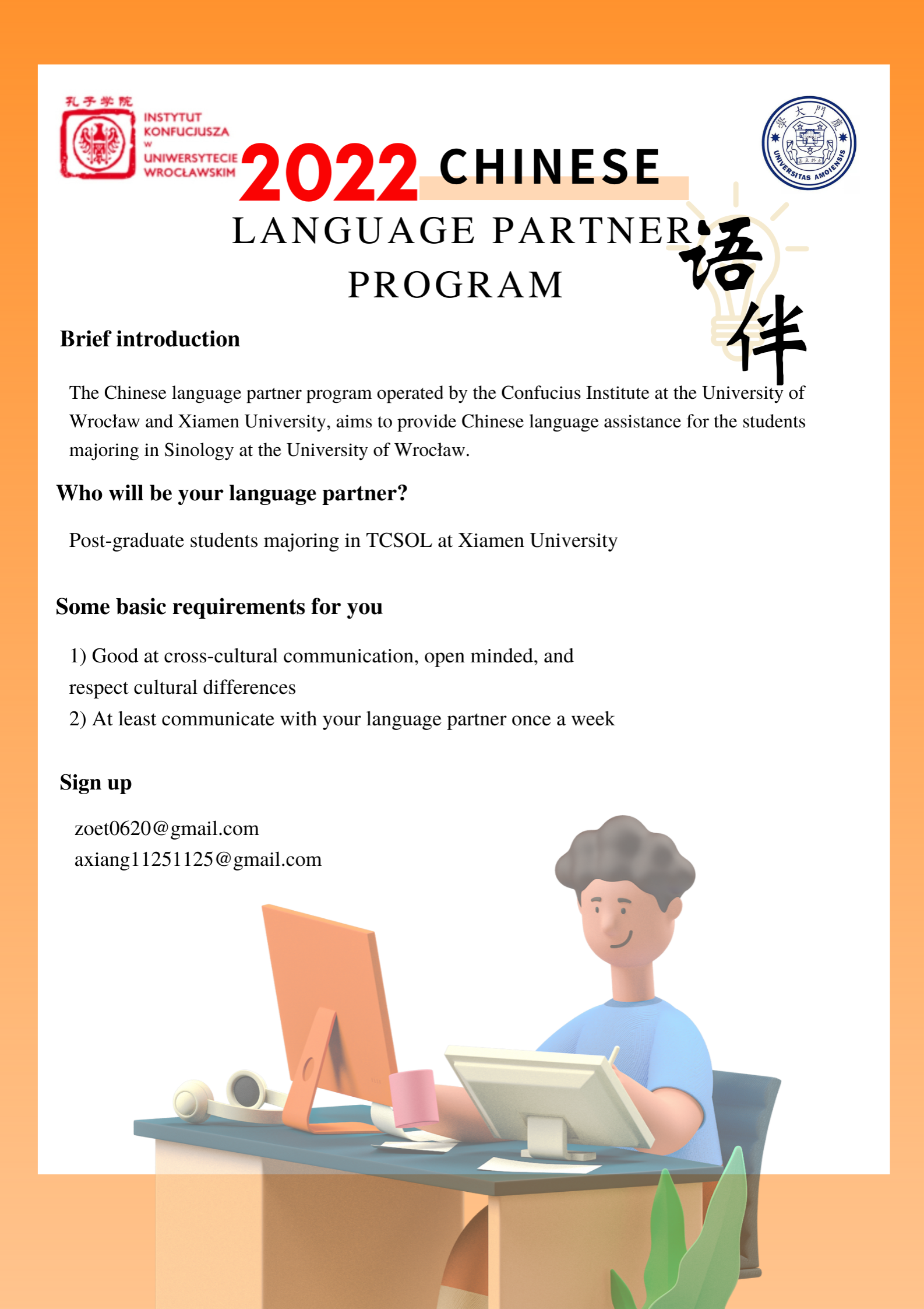 2022年春季学期伊始,弗罗茨瓦夫大学孔子学院携手厦门大学国际中文教育学院共同开展“中波语伴项目”。作为该项目的发起人,孔院中方院长夏国香副教授谈到项目开发缘起时说,弗罗茨瓦夫孔院学员大多性格内敛,不善于表达。但是,对汉语及中国文化十分感兴趣。孔院希望为学员与厦大国际中文教育学院在读研究生建立语伴关系,进行交流、互助,提高学员汉语交际能力和口语水平。此外,希望能通过交流让波兰学生更好地了解中国国情及文化,了解中国大学校园文化。
