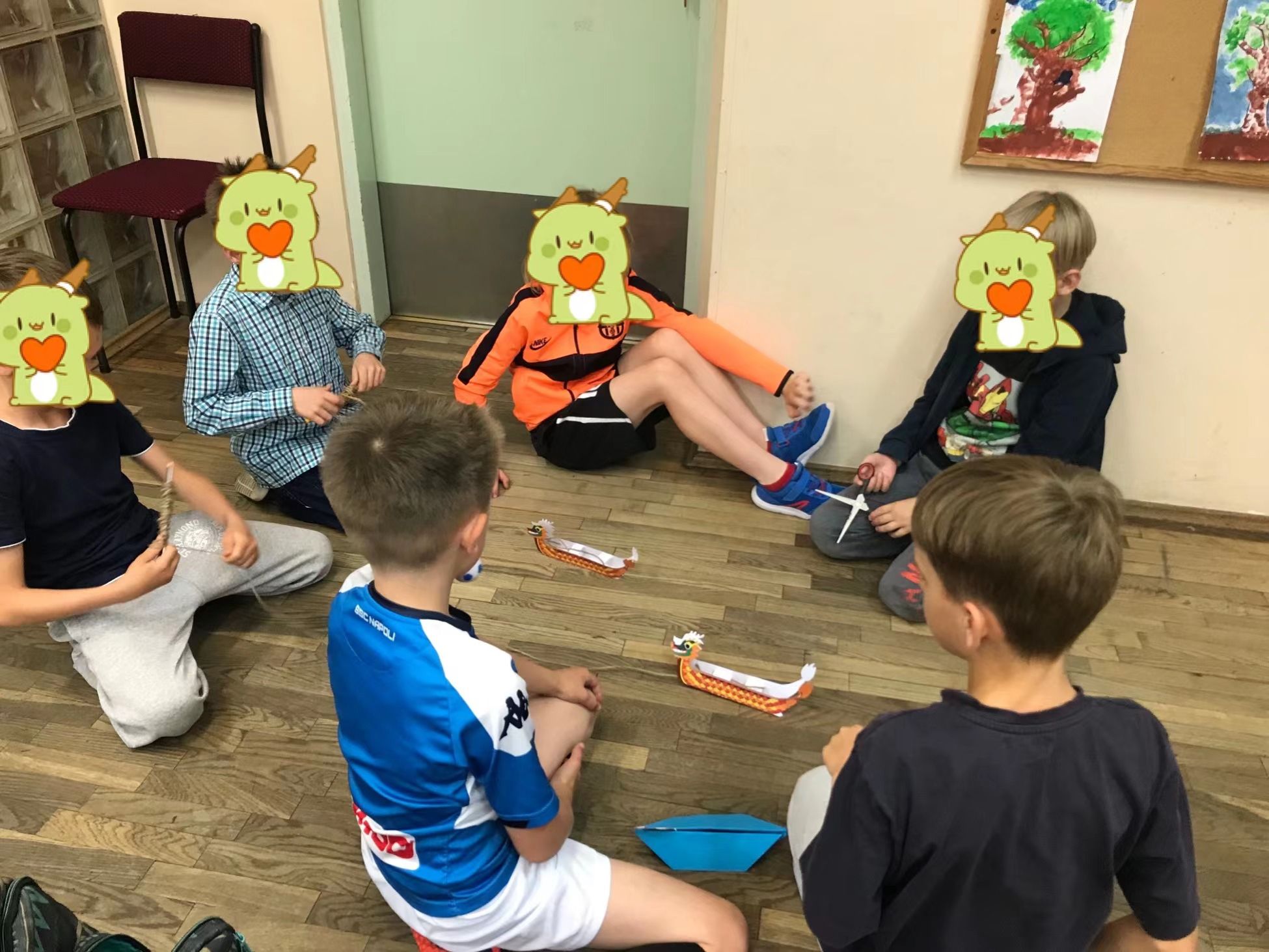 节日气氛不可缺少的还有一些传统活动。在老师的指导下,学生们都制作了自己的小龙舟。小朋友一步一步地折叠彩色纸完成小龙舟的船体,画出龙头,贴在上面。接着,老师组织小龙舟赛,在纸龙舟上挂一根线,参赛者用铅笔卷线来推动龙舟,快者赢!