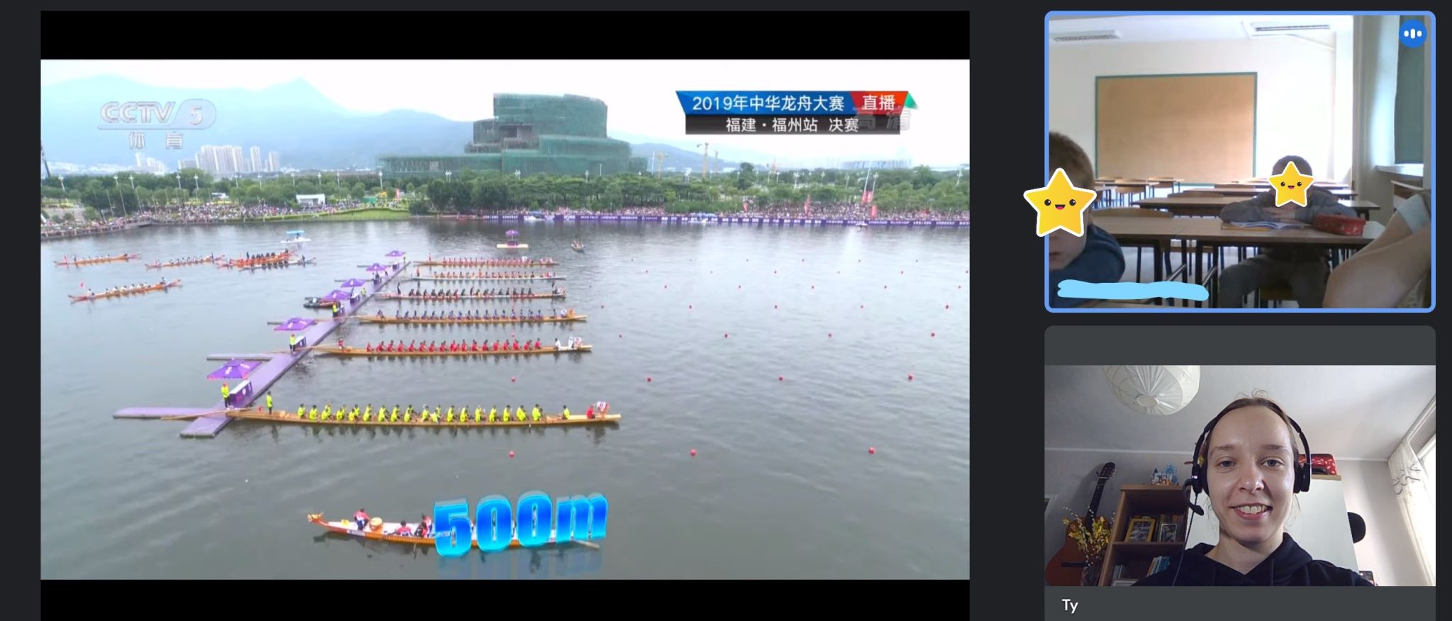 莫莉卡老师首先介绍端午节来源,学生们全神贯注地听有关屈原的传说,通过互动问答方式尝试猜测发生了什么。接着,老师展示图片并解说龙舟知识,带学生一起观看龙舟赛视频。