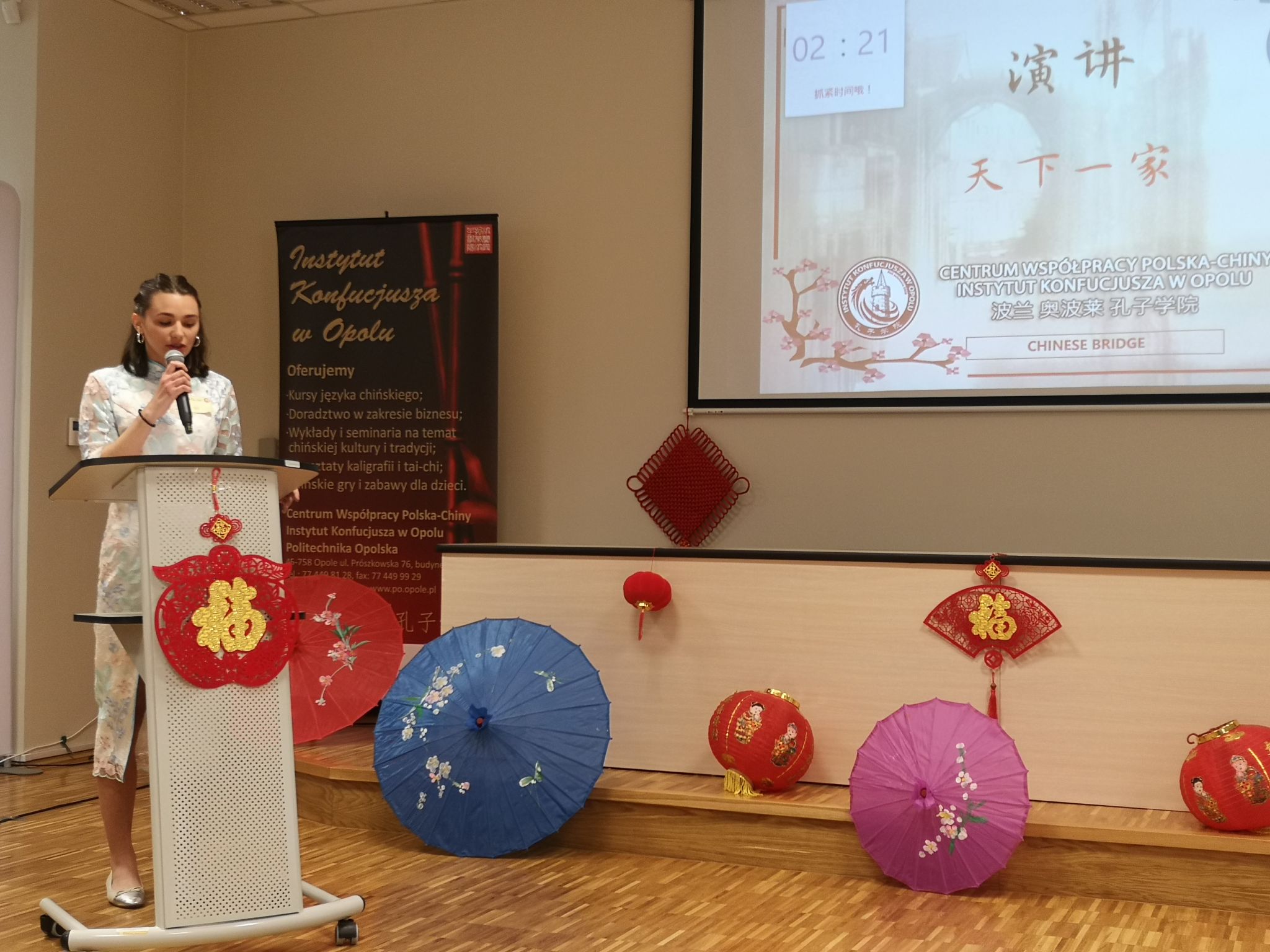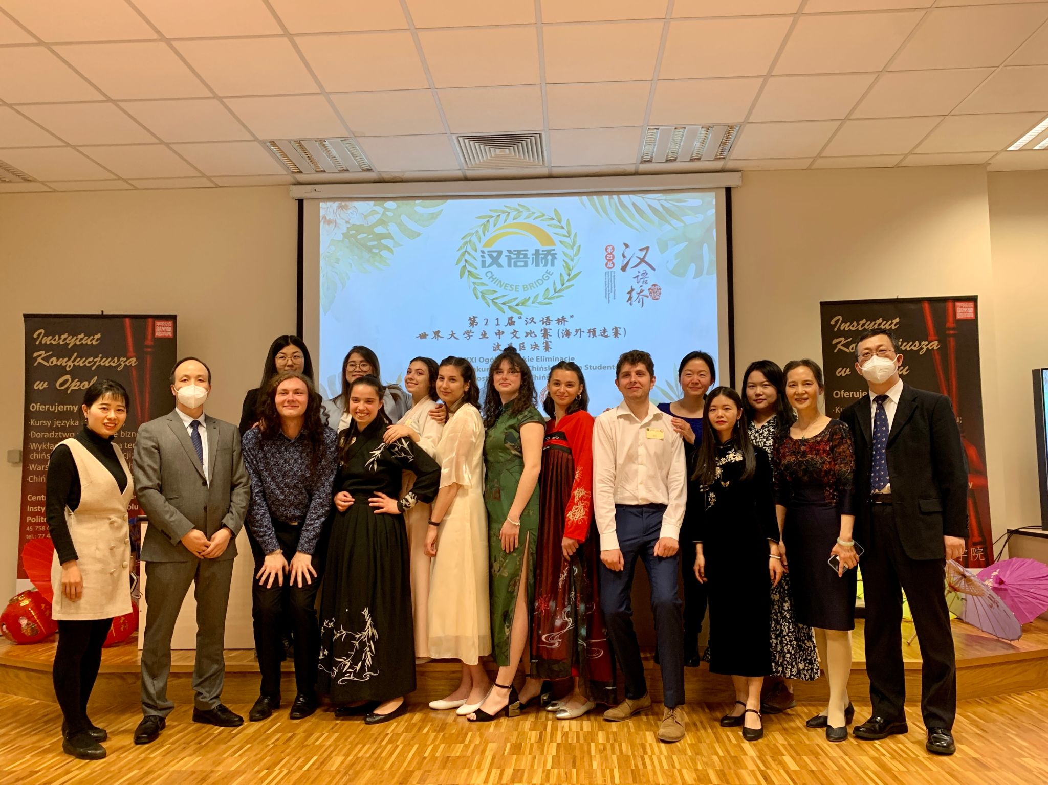 5月26日适逢波兰母亲节,第21届“汉语桥”世界大学生中文比赛(海外预选赛)波兰区决赛于奥波莱举行。此次比赛由中国教育部中外语言交流合作中心与中国驻波兰大使馆主办,奥波莱孔子学院承办。弗罗茨瓦夫大学孔院七名学生,安浩阳(Paweł Andraszak)、严士姿(Dominika Jędrzejczyk)、罗琳(Karolina Szymańska)、郭璐泽(Marta Głogowska)、弥恬风(Daniel Mickiewic)、杜茜茜(Dobrosława Jarek)及连艳歆(Yelizavieta Yakovleva)入选本次比赛。罗琳(Karolina Szymańska)同学获得三等奖,其余同学获得优胜奖。弗罗茨瓦夫孔院中方院长夏国香副教授担任团长,带领参赛学员和指导教师参加了此次比赛。同时,夏国香院长也承担了此次“汉语桥”波兰区决赛的评委工作。