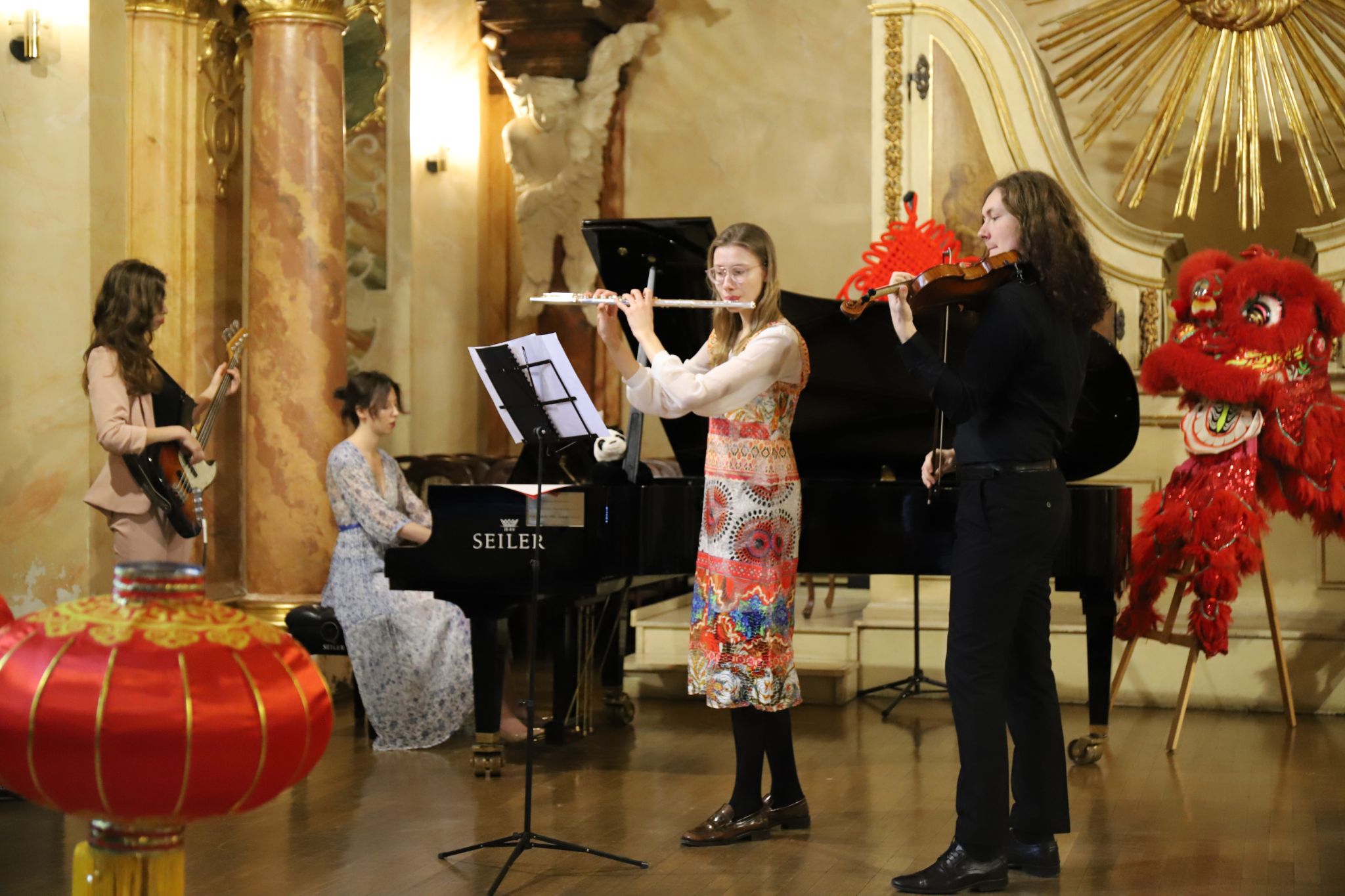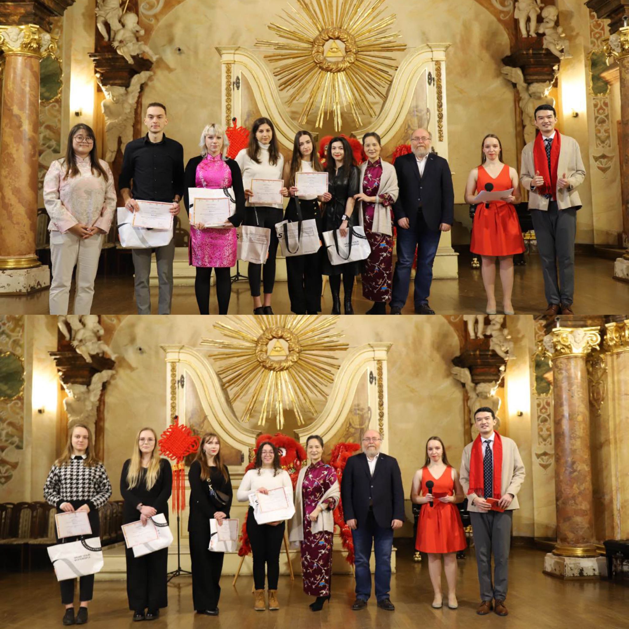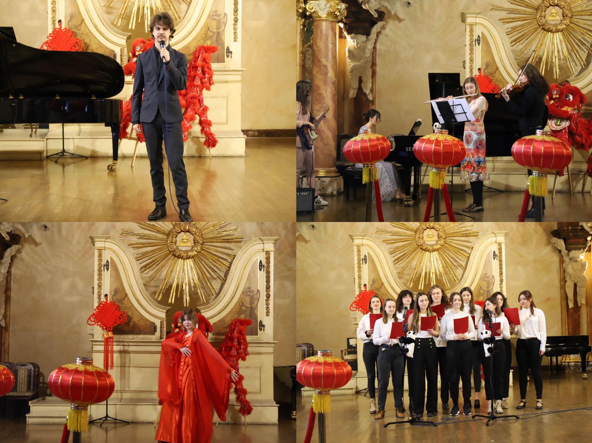 金虎送春归,玉兔迎春到。当地时间2023年1月28日正午12时,由弗罗茨瓦夫大学孔子学院主办的2023年春节联欢会正式开始。弗大汉学系学生弥恬风(Daniel Mickiewicz)、韦唯(Marta Weber)等学员带来小提琴、钢琴等乐器联奏,在开场乐章《梁祝》的美妙音符中,兔年春节联欢活动伴随着冬日暖阳如约而至。孔院波方院长Gościwit Malinowski教授、中方院长夏国香副教授等嘉宾悉数到场,孔院学员及家人近百人欢聚一堂,弗罗茨瓦夫大学音乐厅华灯异彩,节目纷呈。