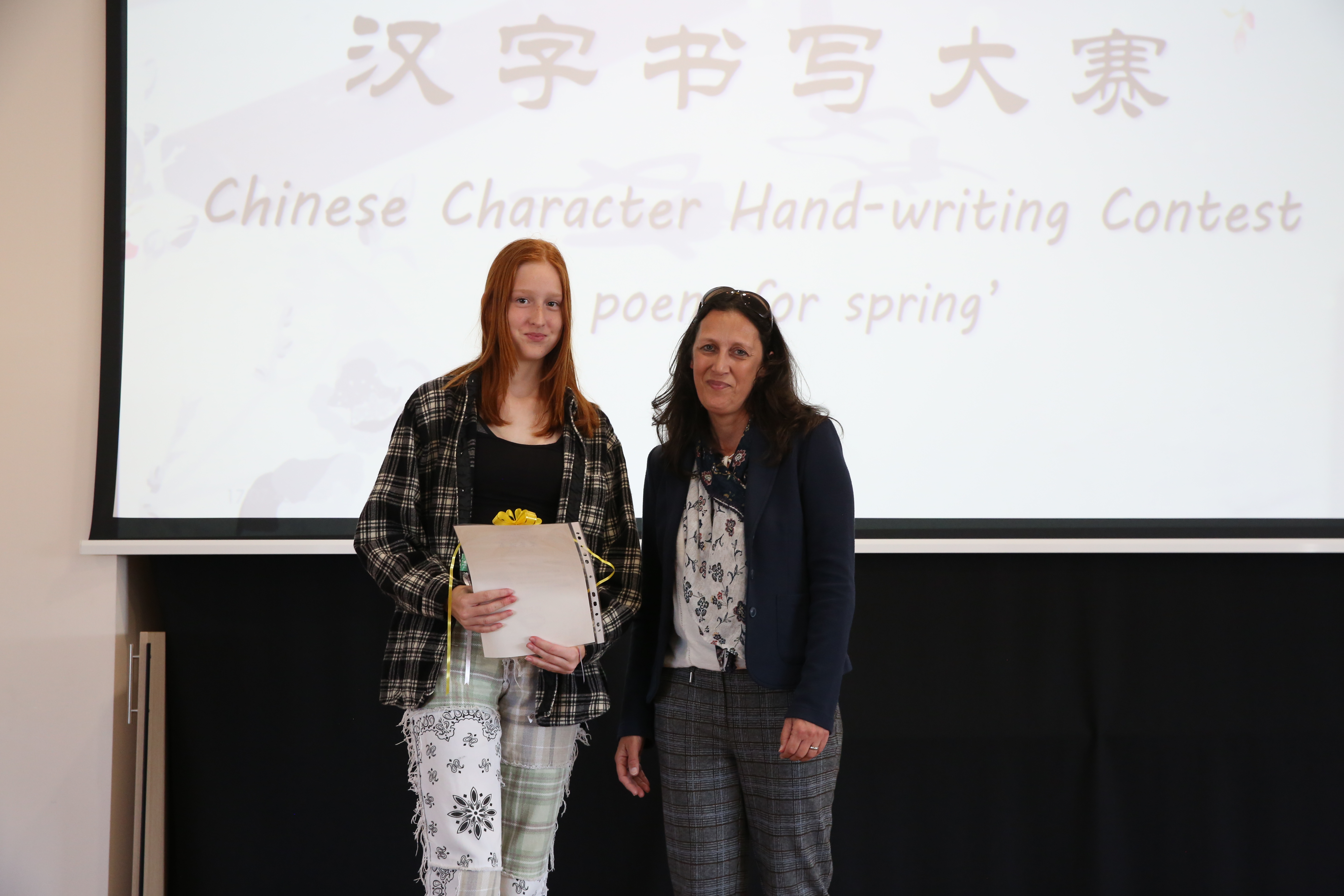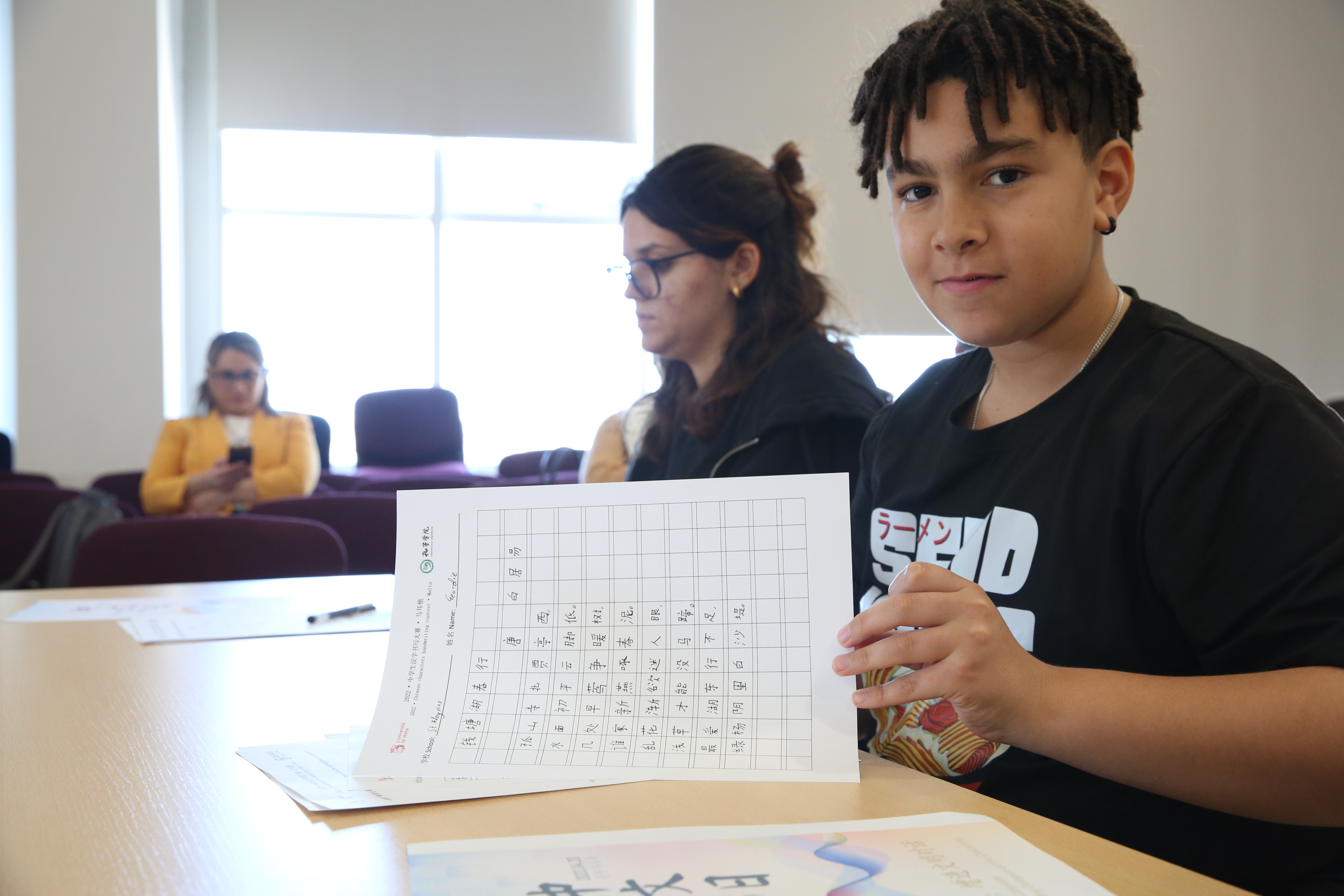 来自马耳他五所中学的十六位学生,以“写给春天的诗”为主题,分别进行了硬笔汉字抄写比赛和中国书法体验。硬笔汉字抄写部分,同学们参照老师给出的《春晓》和《钱塘湖春行》两首唐诗,自行在纸上誊抄。规定时间内,比赛现场鸦雀无声,同学们一笔一划地认真写下了横平竖直,遇到结构略复杂的汉字,还会在草稿纸上先练习一次,再正式写在方格内。来自马耳他圣马丁中学八年级的伊莎贝尔·蒙坦·利维耶尔获得一等奖。