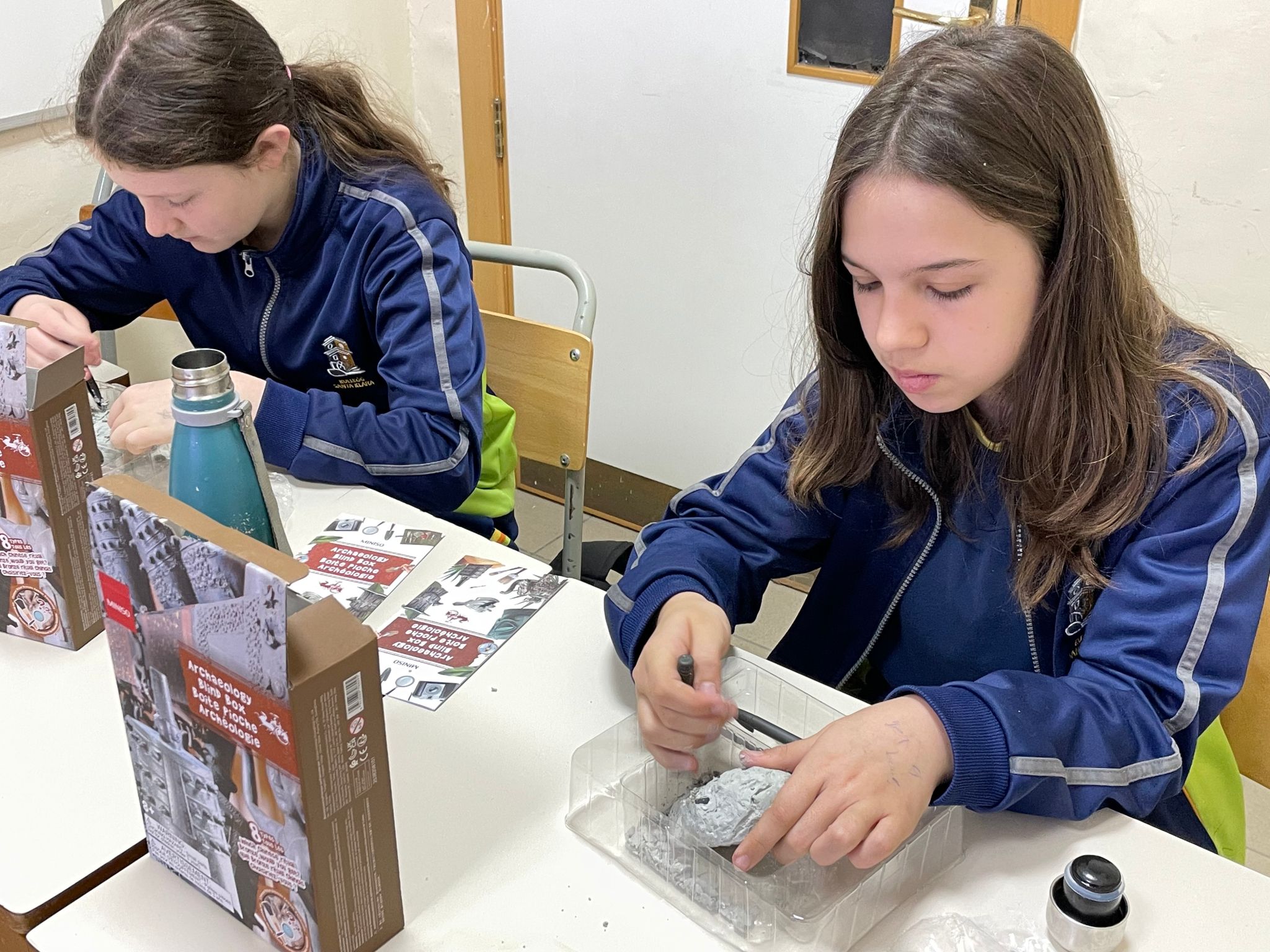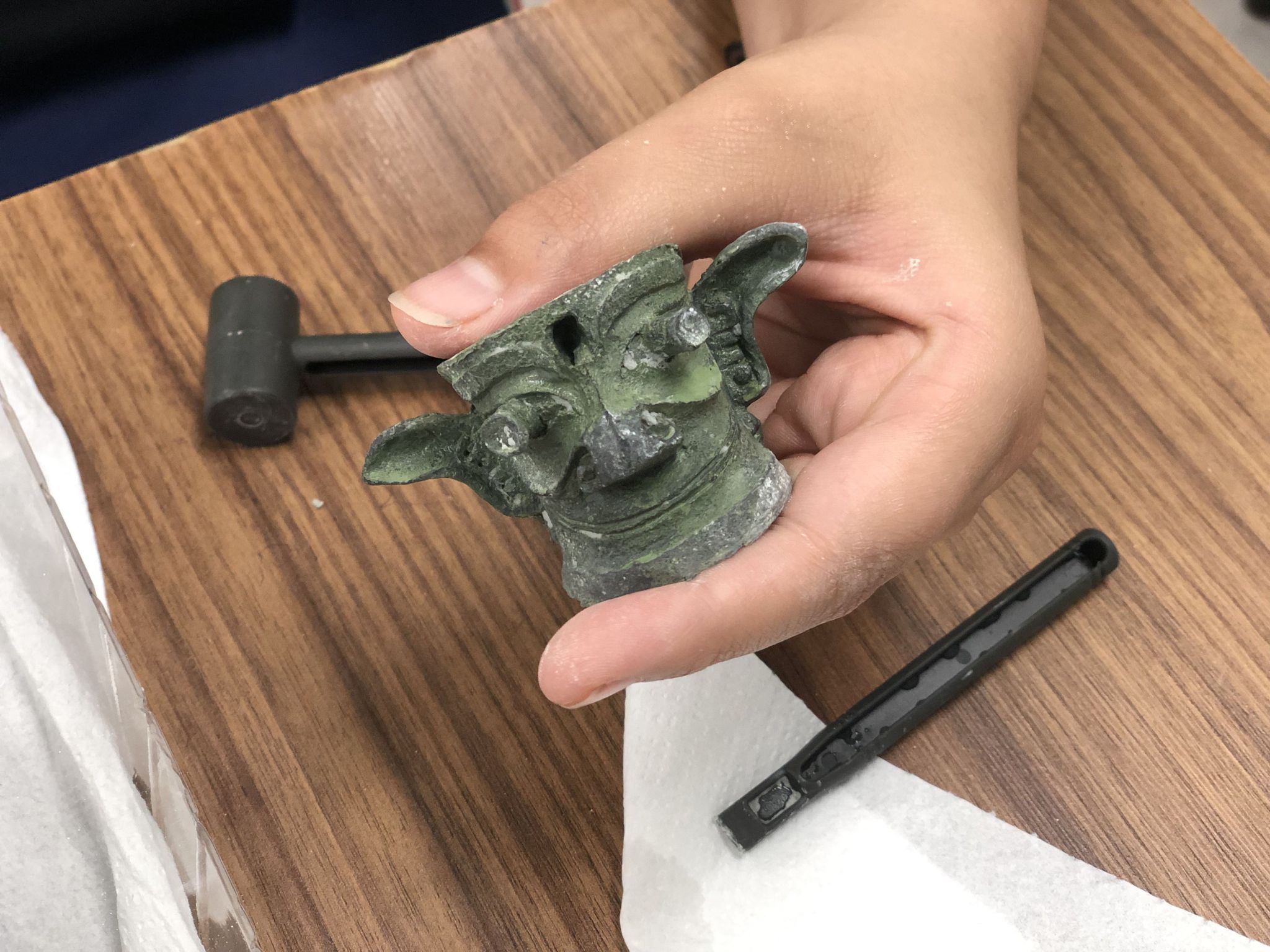 观看中国近现代的考古成果后,老师们还为大家准备了实践活动——考古盲盒。盲盒刚一拿出来,大家便兴奋地说:“老师我要挖一个三星堆面具!”“我也要!不,我觉得鼎也不错。”同学们面前摆着被陶土包裹的仿真文物,手边放着小工具锤、小刷子和挖掘棒,俨然一副专业考古的架势。一番敲敲打打之后,“文物”露出了一角,立刻换成小刷子轻轻扫去泥土,再继续用挖掘棒和小锤子整理旁边大的石块儿。每个人都专心于自己的“考古”工作,时不时看着露出的部分猜测自己会挖到哪一款“文物”,每个人都小心翼翼地期待着亲手揭开手中模型的神秘面纱。
