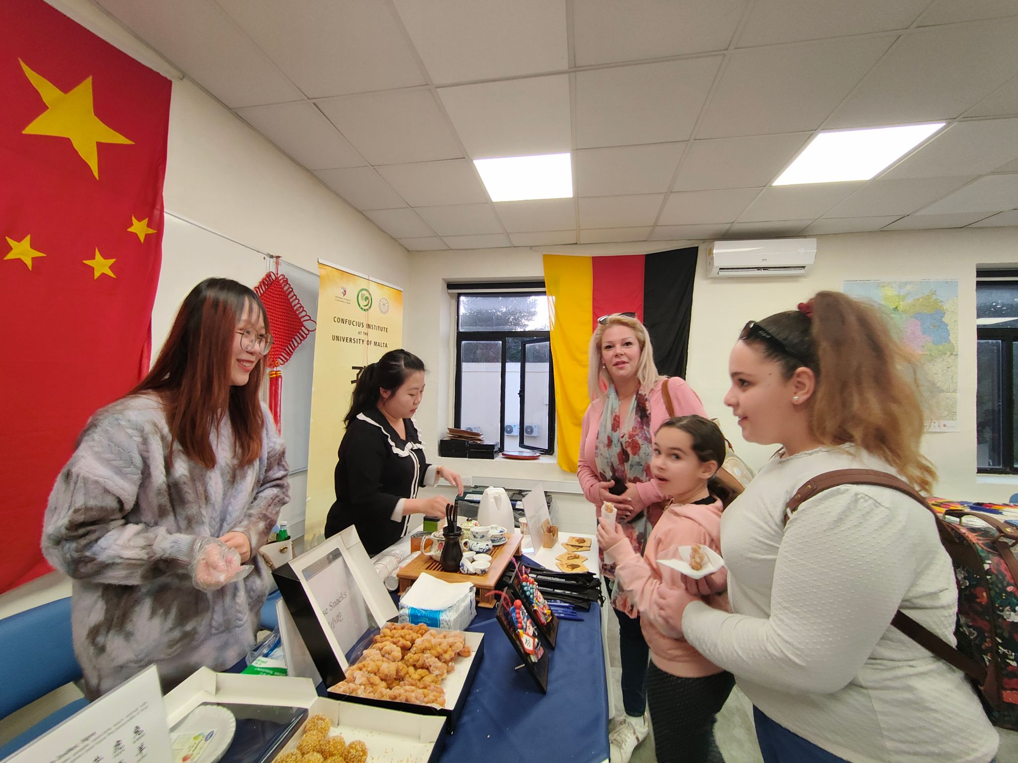 中国小吃体验台的特色茶点小食更是让马耳他群众大饱口福。色泽金黄的中国麻花因其味道香甜、与马耳他当地人的口味接近而受到追捧,外酥内糯的麻圆带着芝麻的诱人香气赢得了体验者的一致好评。志愿者教师吴思薇从食物名称、食材构成讲到小吃的制作方法,细致地向大家介绍了中国饮食文化的丰富内涵。