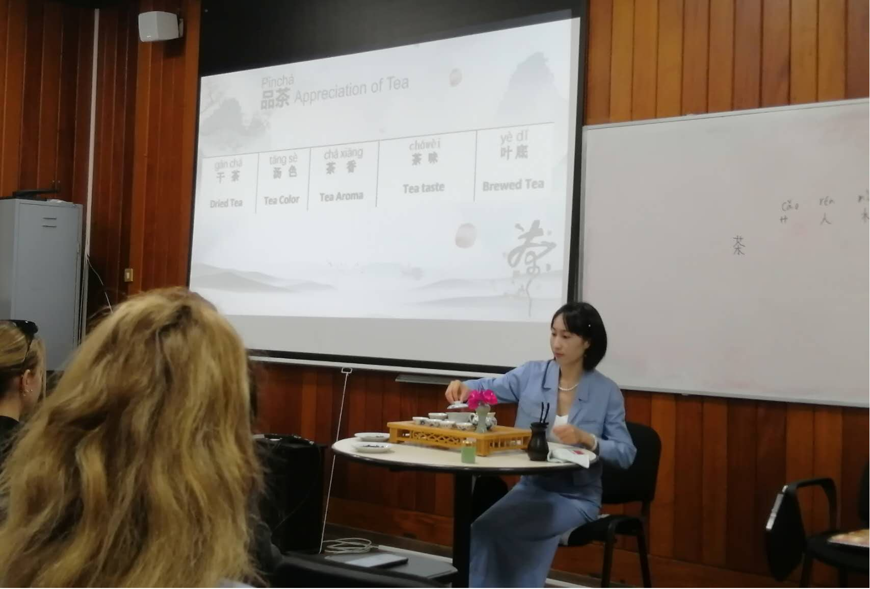 活动中,孙怡老师现场演示功夫茶,以优雅的姿势结合不同茶类的冲泡技巧,将一杯芳香四溢的好茶呈于师生们的面前,从视觉、嗅觉和味觉三管齐下,邀请大家观茶色、闻茶香、品茶味,通过“茶”之于“艺”的全套礼仪展示,让师生们真正了解“中国茶”以及“中国茶艺”之美,以“茶”知“艺”,以“艺”知“礼”。师生们就“中国茶艺”及中国文化的问题不断提问,主讲人一一作答。
