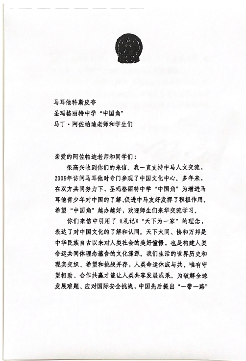 当地时间8月8日,驻马耳他大使于敦海向马耳他圣玛格丽特中学教师阿佐帕迪•马丁(Azzopardi Martin)转交了习近平总书记致“中国角”师生的回信。在信中,习近平总书记表示一直支持中马两国的人文交流,两国关系已经成为不同历史、不同文化国家友好相处的典范,同时充分肯定了圣玛格丽特中学“中国角”对促进中马友好发挥的积极作用,并鼓励更多马耳他师生和青少年积极参与中马人文交流,做文明互鉴的促进者和人民友好的传承者。