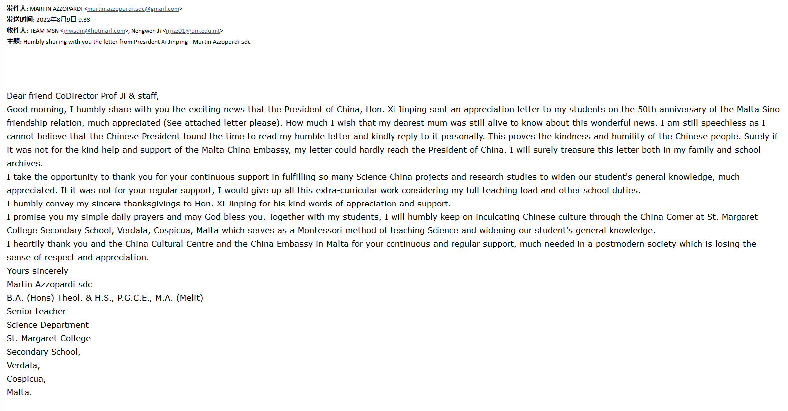 阿佐帕迪老师在收到习近平主席的来信后,第一时间向马耳他大学孔子学院发邮件分享好消息。他自称喜出望外,衷心感谢习近平主席对“中国角”师生的鼓励,也十分感谢马耳他大学孔子学院和其它中方机构长期以来的帮助,他表示将以习近平主席回信为动力,再接再厉办好“中国角”项目,为促进两国文化交流、增进民间友谊作出更大贡献。