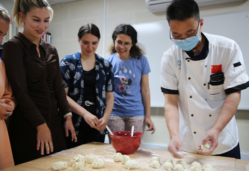 讲座之后的豆沙包的制作和品尝将本次活动推向了高潮。今年北京冬奥会期间,马耳他代表团运动员珍妮斯·斯皮泰里(Jenise Spiteri)因在比赛间隙吃豆沙包而走红网络,“豆包小姐姐”被央视新闻联播、马耳他时报等中马双方的主流媒体报道后,屡次登上社交媒体热搜榜,“豆沙包”这一中国美食引起了马耳他人民极大的好奇心。为了满足马耳他大学师生们对于“豆沙包”的热情,拥有20余年烹饪经验的吕达焰师傅现场演示,并手把手教同学们如何制作美味的“豆沙包”。同学们兴致高昂,积极参与,争先恐后地表达自己对中国美食的喜爱,现场充满了欢声笑语。