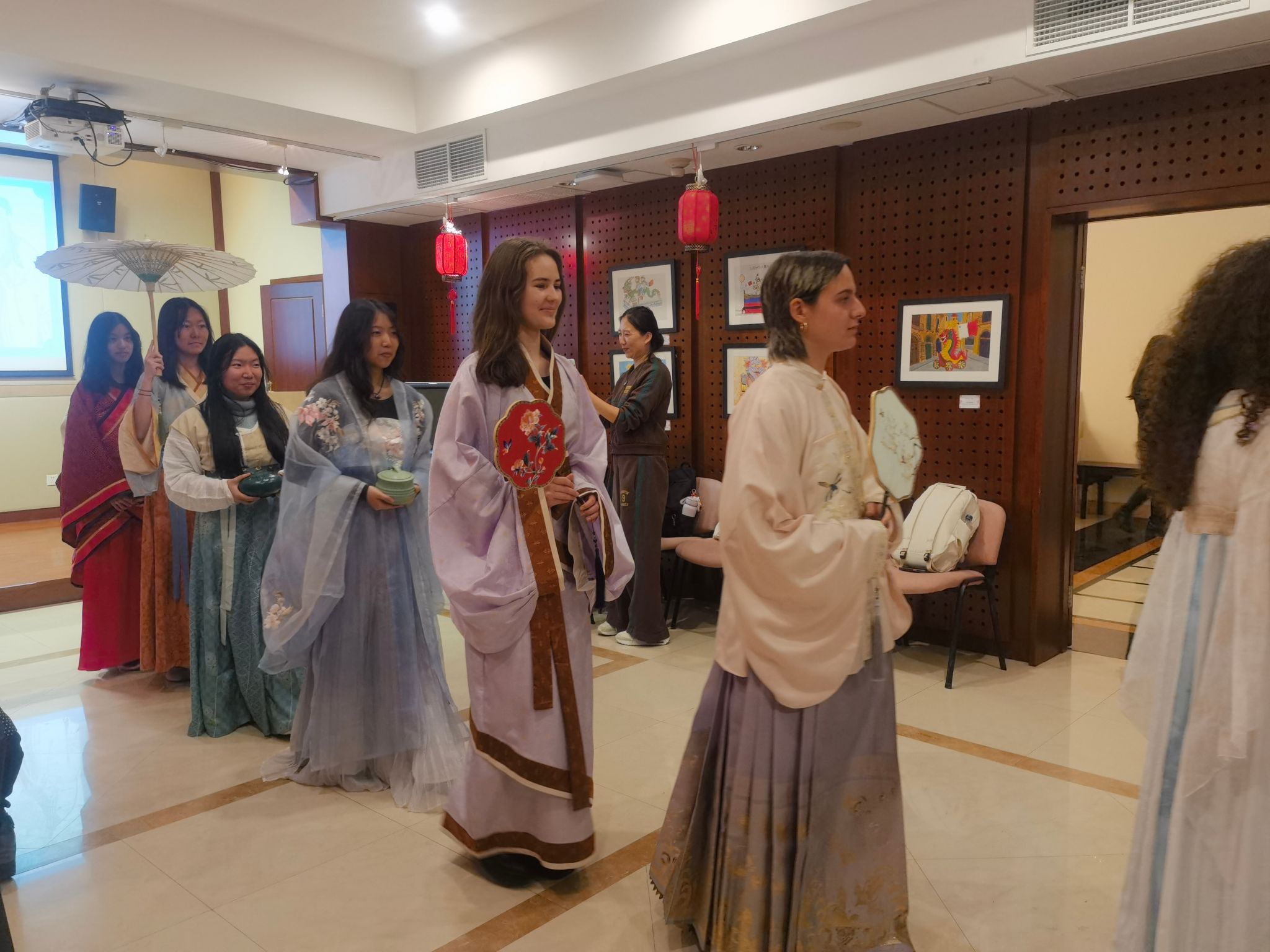 活动开场,学生们就被苏绣、风筝、熊猫屏风等中国非遗展品深深吸引,近距离感受着传统艺术的独特魅力。随后在文化中心图书室的参观中,他们进一步探索了中华文化的深厚底蕴。音乐厅里,《孔子文化》和《世界自然文化遗产在中国》两部专题短片,通过生动的影像资料带领学生们走进中国的历史长河。汉服展演区中,学生们身着曲裾深衣、唐制齐胸襦裙等传统服饰,伴着《礼仪之邦》的悠扬乐声,亲身体验华夏衣冠的千年演变。古琴名曲《流水》的演奏更是以空灵琴韵征服了在场师生,让人沉醉于千年文化的传承之中。在书法体验环节,"礼乐天下"的临摹让学员们真切体会到汉字艺术的精妙。而茶道展示则通过铁观音和龙井的冲泡仪式,将"以茶会友"的待客之道与"天人合一"的哲学思想娓娓道来,完美诠释了中华传统文化中和谐共生的智慧精髓。
