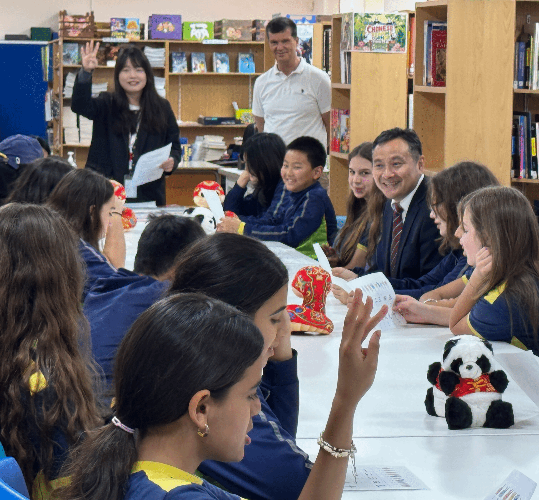 随后,孔院教师现场教授学生基本中文问候语及数字词汇,并通过数字歌和互动游戏的方式进行巩固练习。欢声笑语中,校长帕彻高兴地说:“我现在也能用中文数数了!”活动最后,师生们还品尝了多种中国风味小吃,对中国美食的色香味赞不绝口。