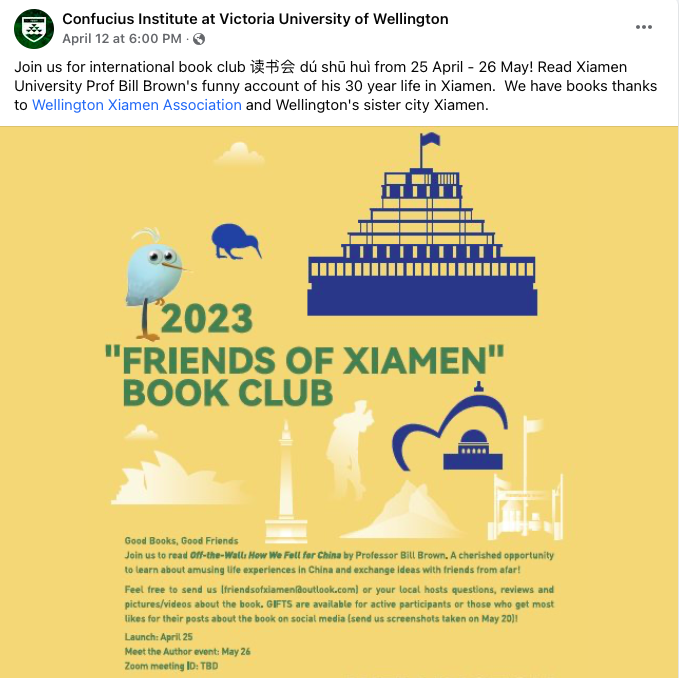 当地时间4月25日中午,厦门市与新西兰惠灵顿、美国巴尔的摩、萨拉索塔、加拿大里士满、澳大利亚阳光海岸等城市共同举办的2023厦门国际友城读书会系列活动在云端正式拉开序幕。作为该活动的新西兰协办方,惠灵顿维多利亚大学孔子学院与惠灵顿-厦门友好协会共同组织孔院师生、当地对华友好人士和爱好中国文化的民众参与到本次读书会的系列活动中来。