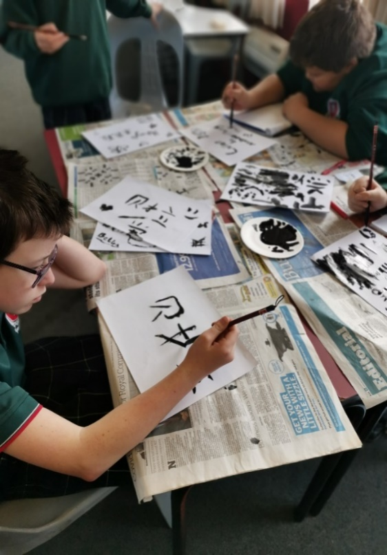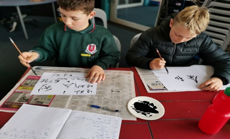 图:新普利茅斯 Highlands Intermediate中学学生在本土教师指导下练习书法