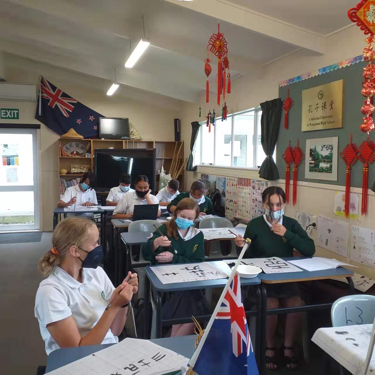 图2 旺格努伊中学孔子课堂的学生体验书法