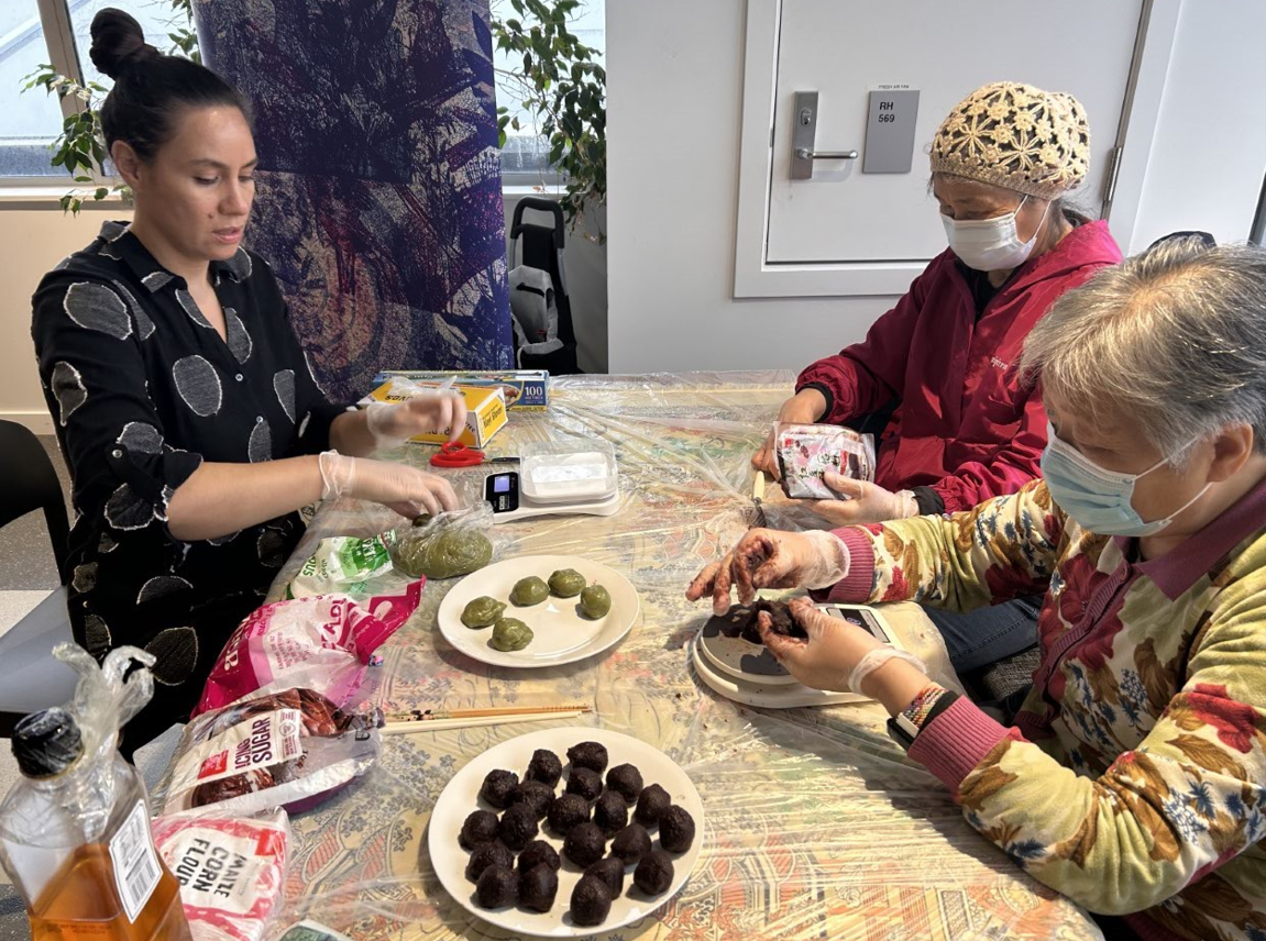 活动当天还特别邀请了新西兰的中式面点师陈秀英女士现场制作茶配——青团。维大教职员工们在闻香品茗之外,进一步感受了中国味道,领略中国传统美食的魅力。青团是中国传统的茶点之一,由糯米粉混合艾草汁制成,通常作为茶点与茶一起品尝,是茶道文化中不可或缺的一部分。青团除了有美食价值,还有着文化内涵和历史背景,是中国茶文化的重要组成部分之一。