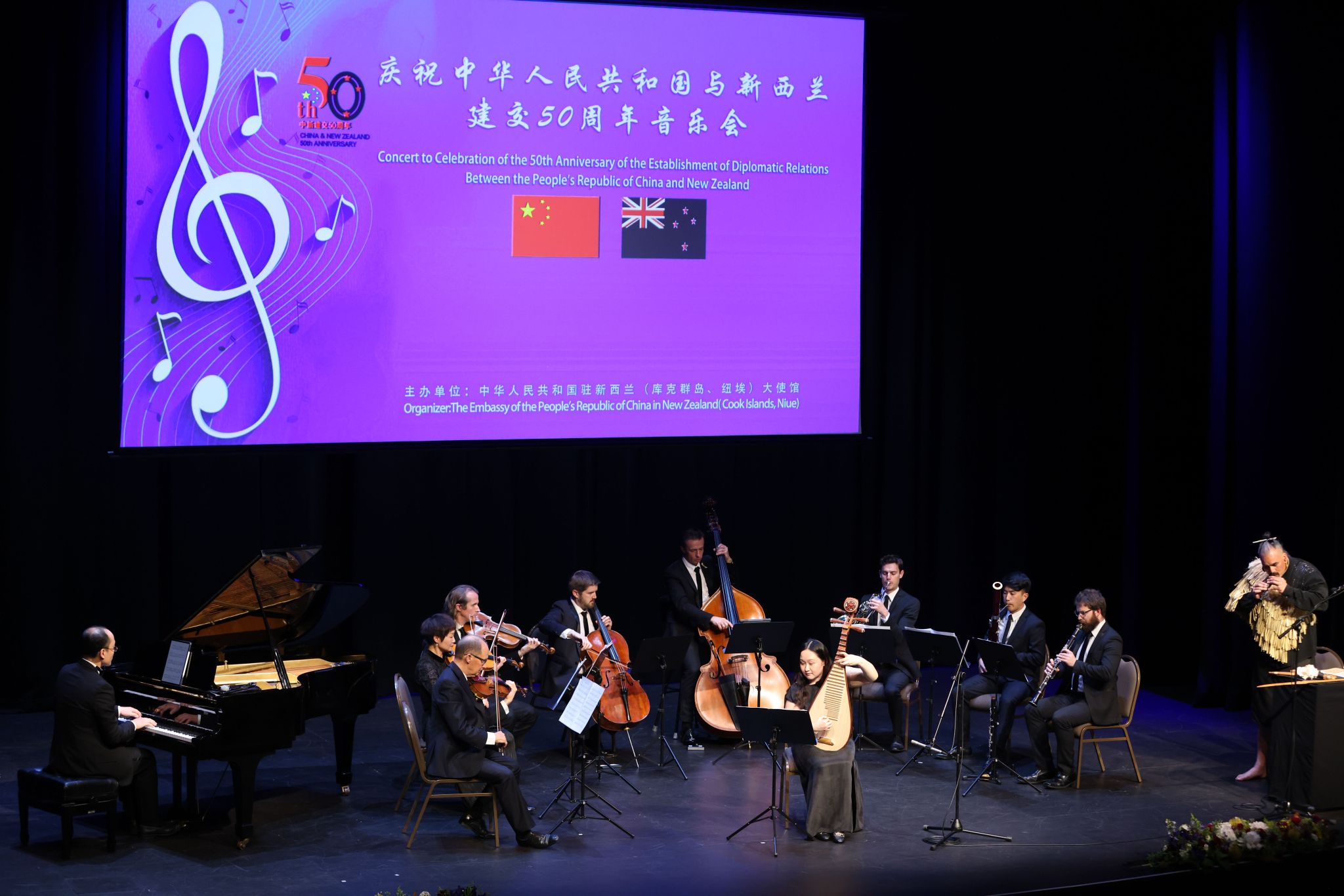 招待会前,举办了庆祝中新建交50周年专场音乐会。整场音乐会由传统乐器、现代经典和共奏友谊三个篇章组成。来自中新两国音乐机构的艺术家,用中国传统乐器、毛利乐器和西方乐器演奏了中国和新西兰脍炙人口的乐曲。一曲悠扬的毛利名曲《生命之源》拉开了音乐会的帷幕。《彝族舞曲》、《送我一枝玫瑰花》、《浏阳河》、《走西口》、《河水湍湍》……一个个节目特色鲜明、形式多样、精彩纷呈,完美呈现了东西方音乐艺术交融互鉴的特色,把音乐会不断推向高潮。最后,音乐会在《我的祖国》经典旋律和与会嘉宾的热烈掌声落下帷幕。