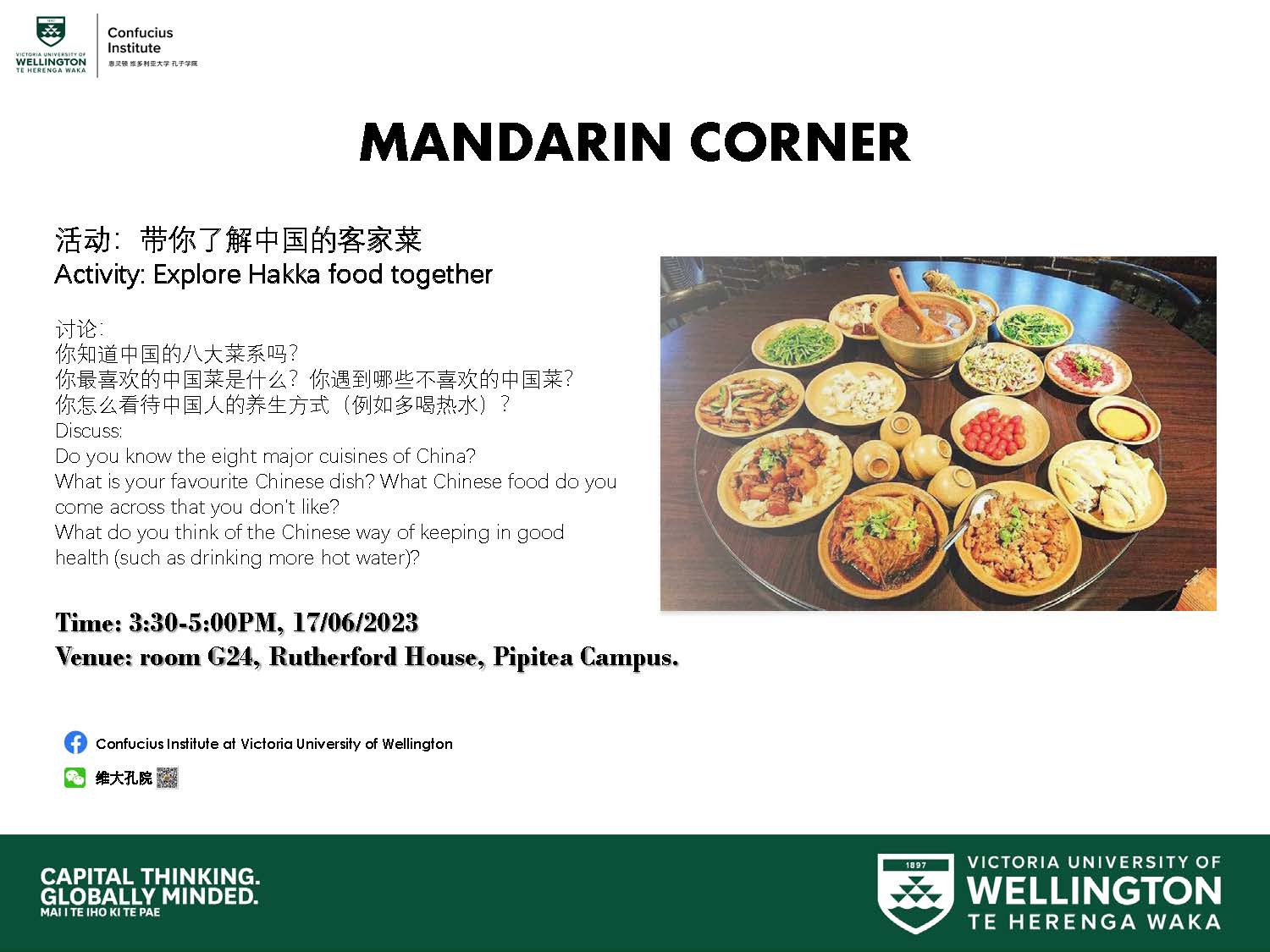 惠灵顿维多利亚大学孔子学院于当地时间6月17日在维多利亚大学Pipitea校区成功举办了一场别开生面的汉语角活动,以探索中国客家菜为主题。此次汉语角在汉语教师陈文倩的指导下,以及MLA卢涵文的策划下,吸引了惠灵顿当地的学生和社区成员的参与。