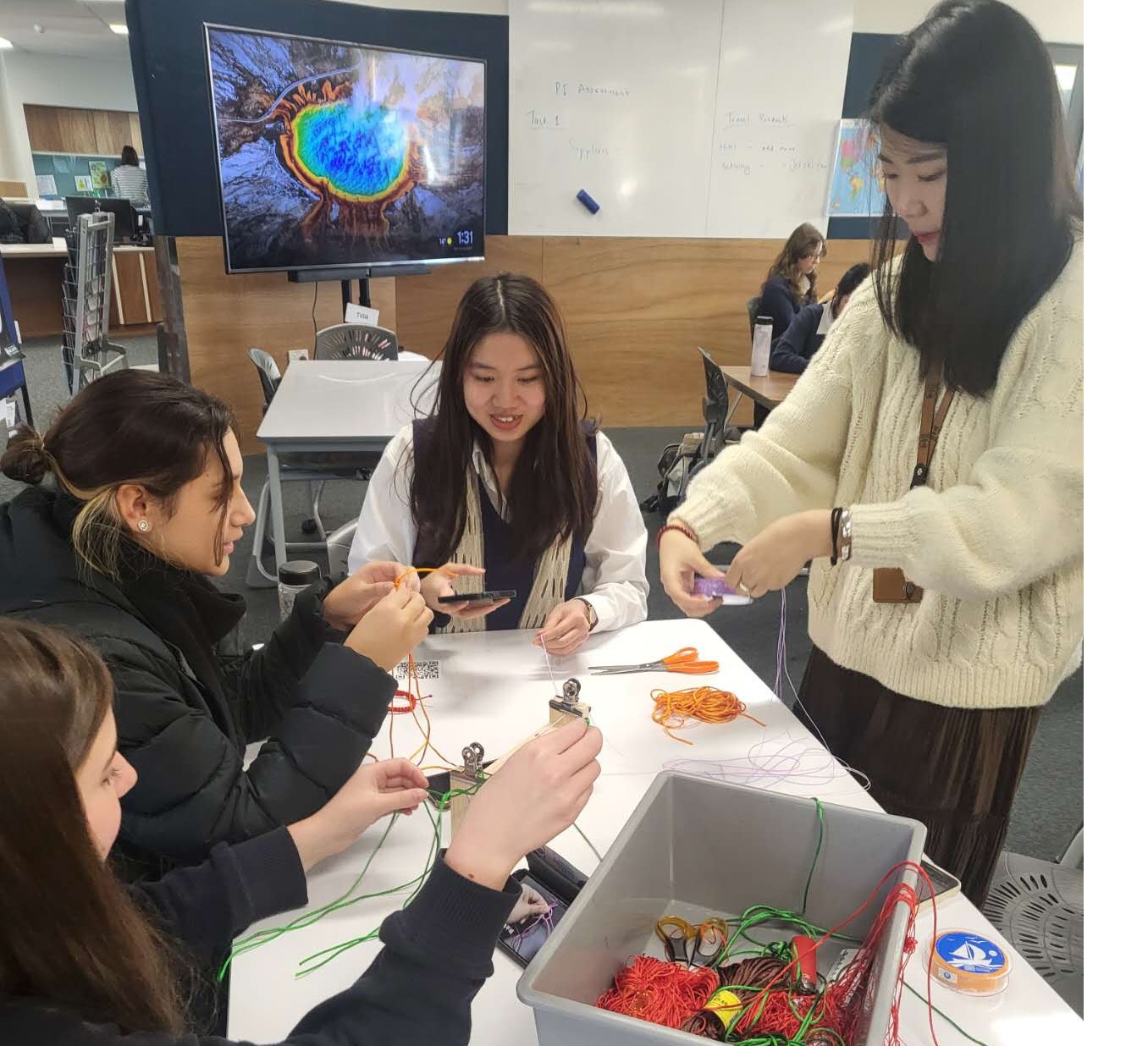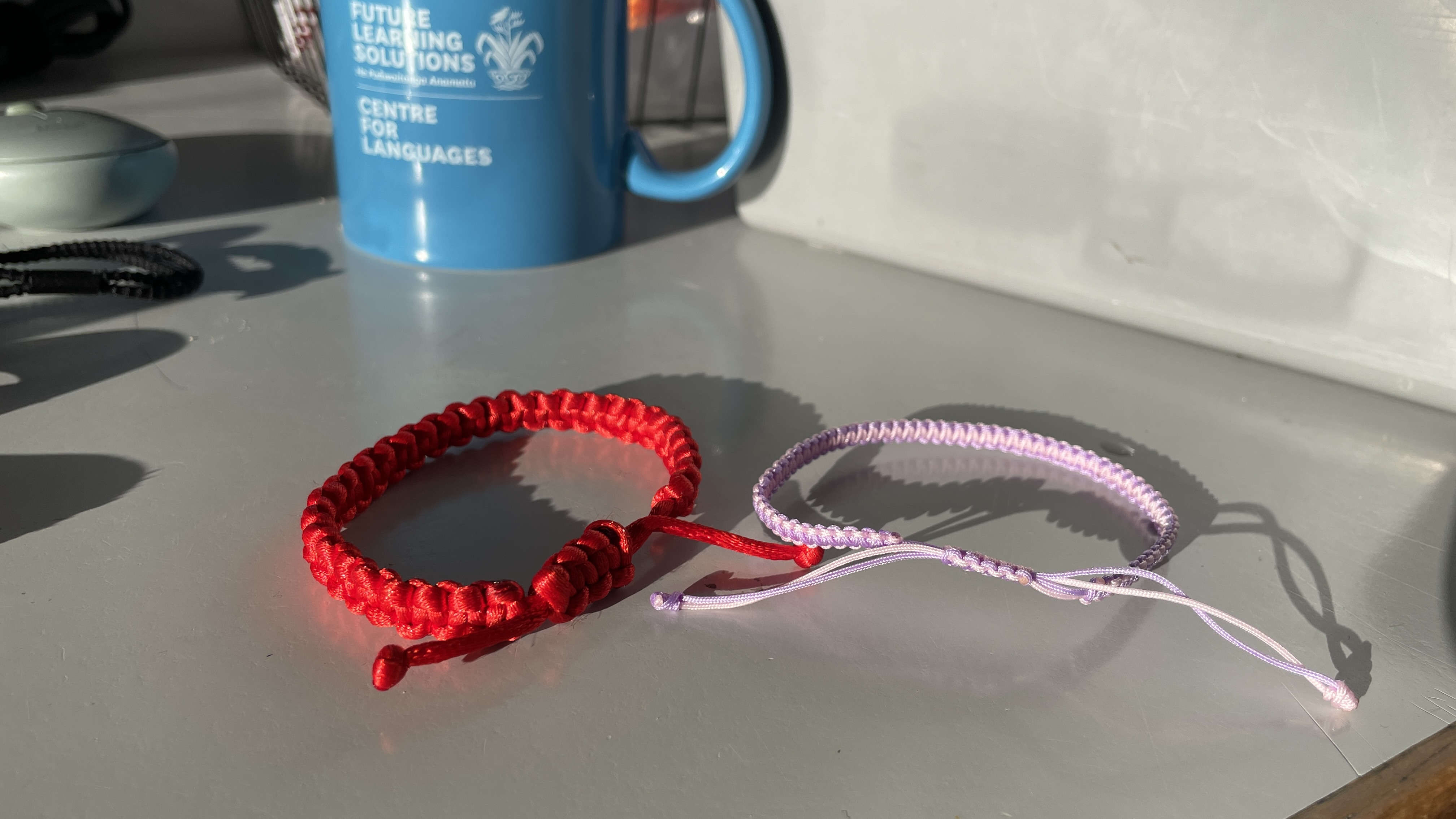 同时,在该校的图书馆开放空间,李颖静带领着一群心灵手巧的师生一同编起了五颜六色的中国结和手绳。大家兴致高昂,一边学习着不同颜色在中国文化中的丰富内涵,一边巧妙地体验中国传统的手绳编织。她们惊叹于这传统的技艺,几根绳子,一双巧手,便能编织出一个个形态各异的艺术世界。