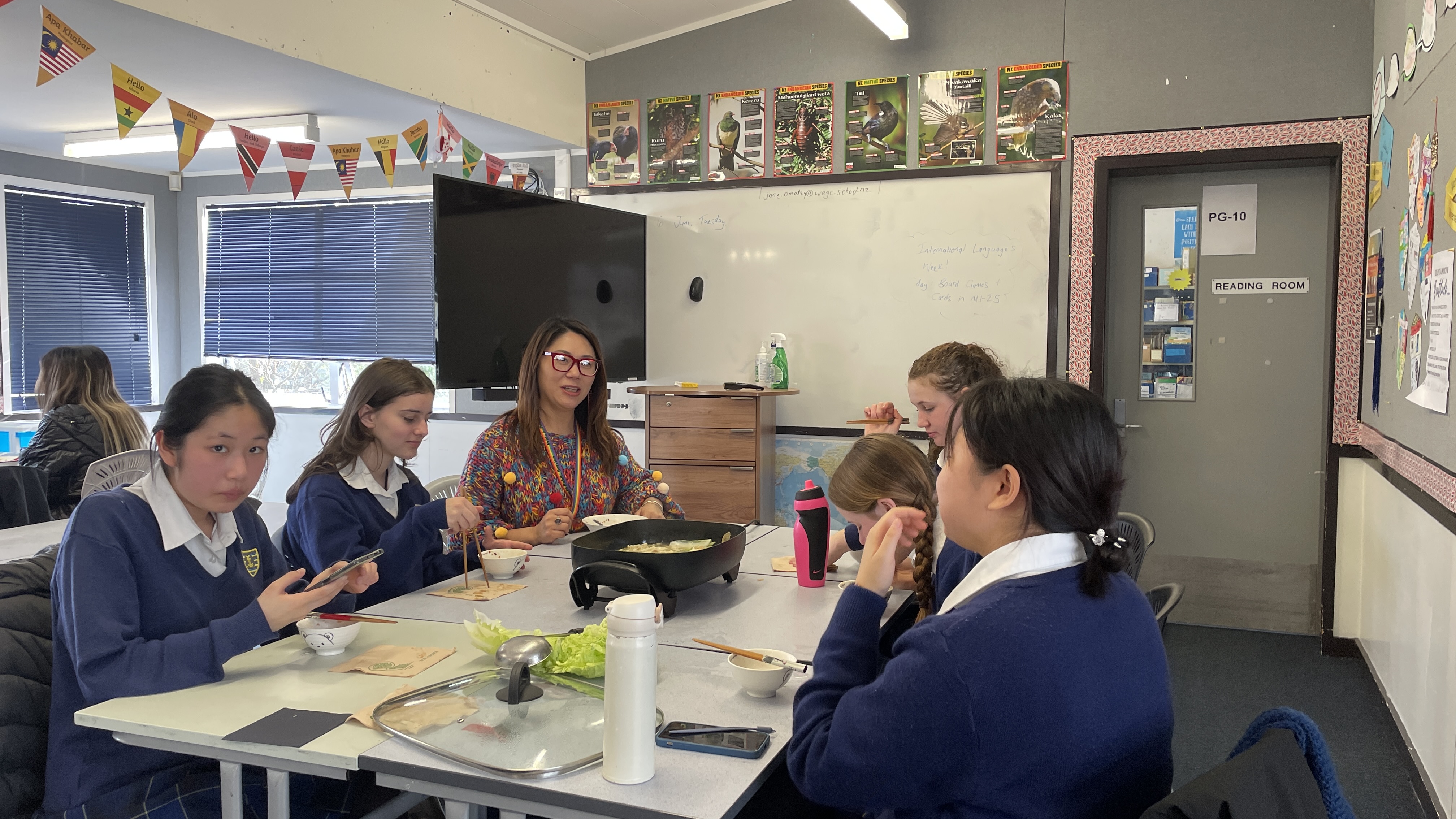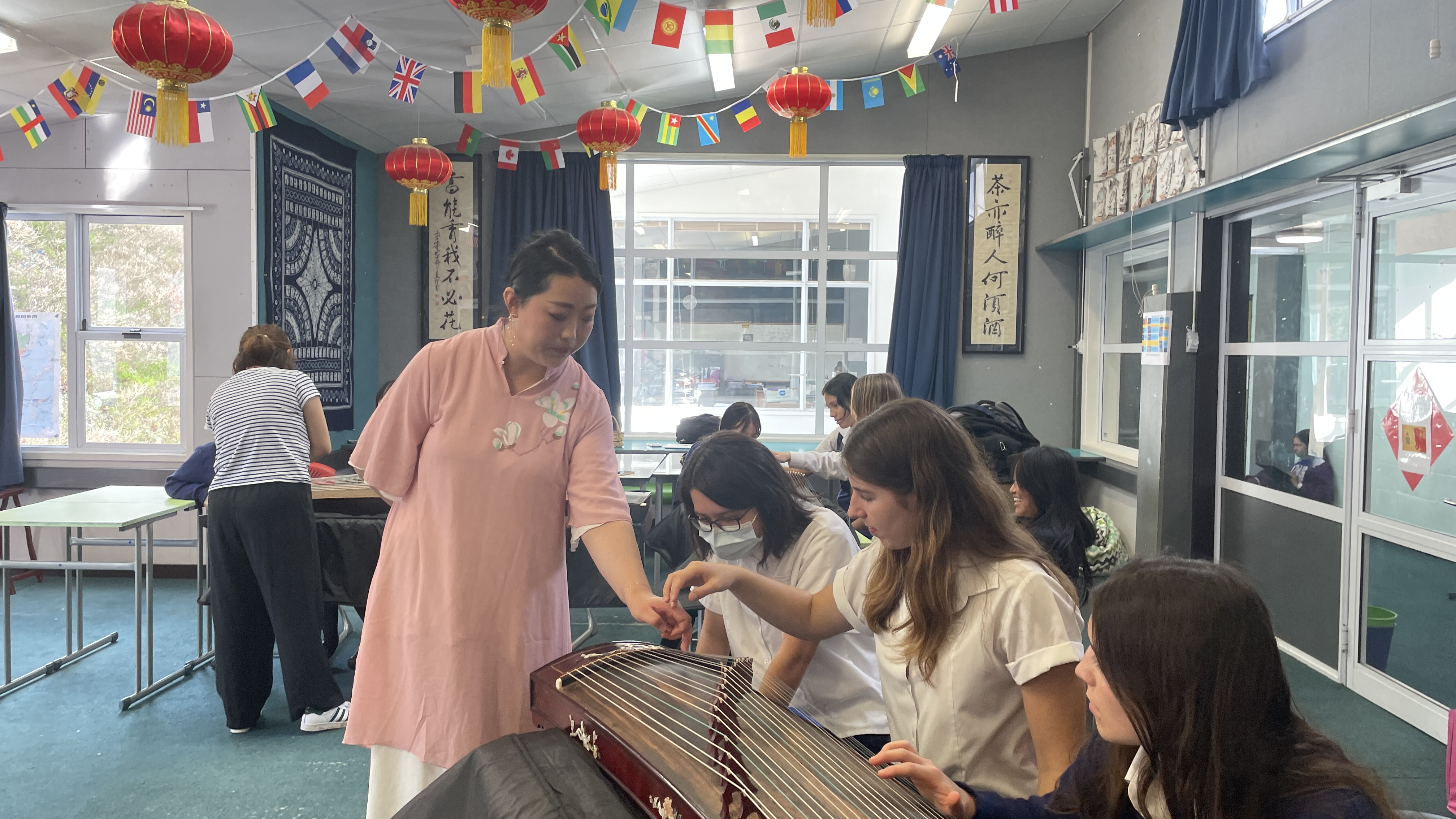 在12、13年级的学生们热热闹闹地饱餐之时,该校9年级和11年级的学生们迎来了丰盛优美的精神盛宴。在孔院教师左若琰的带领下,学生们走进了中国音乐的世界。古筝的悠扬琴音让学生们深深地沉浸其中,《高山流水》让学生感受到山的雄奇壮丽和水的温婉流淌,古筝与二胡合奏的《春江花月夜》更是用音乐为学生绘制了一幅桃花源般的美景。通过古筝体验课,学生们不仅产生了对音乐的兴趣,还加深了对中国音乐文化的理解,激发了他们对不同文化之间的探索和交流的热情。