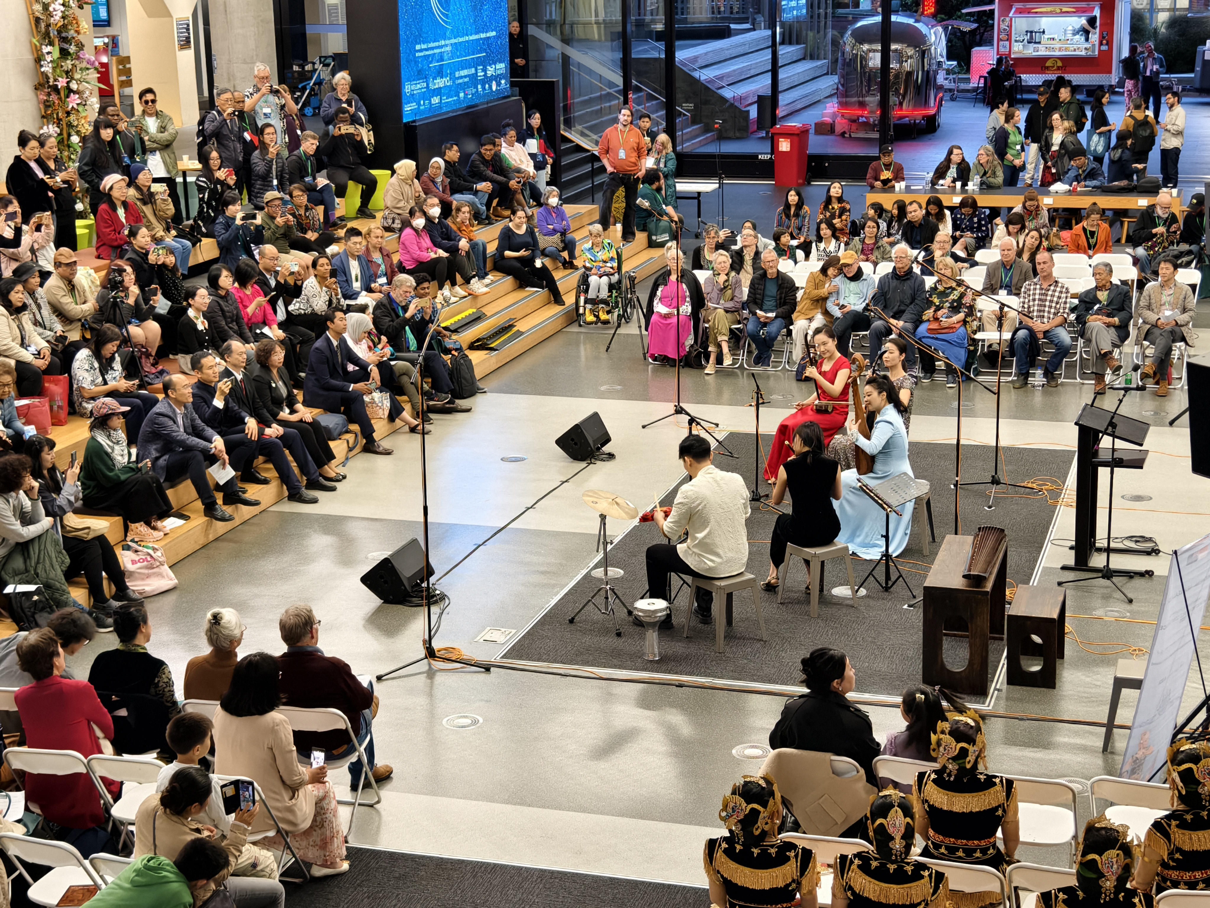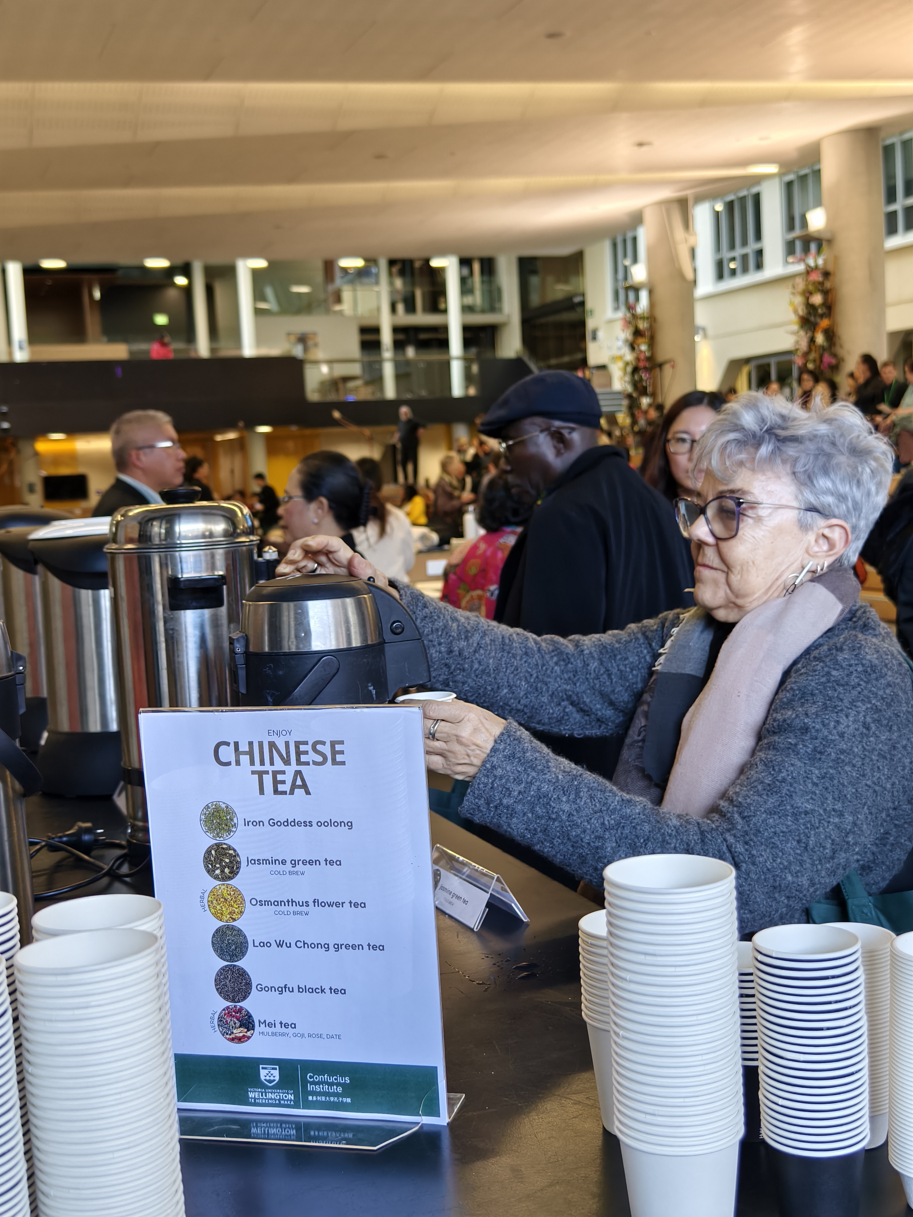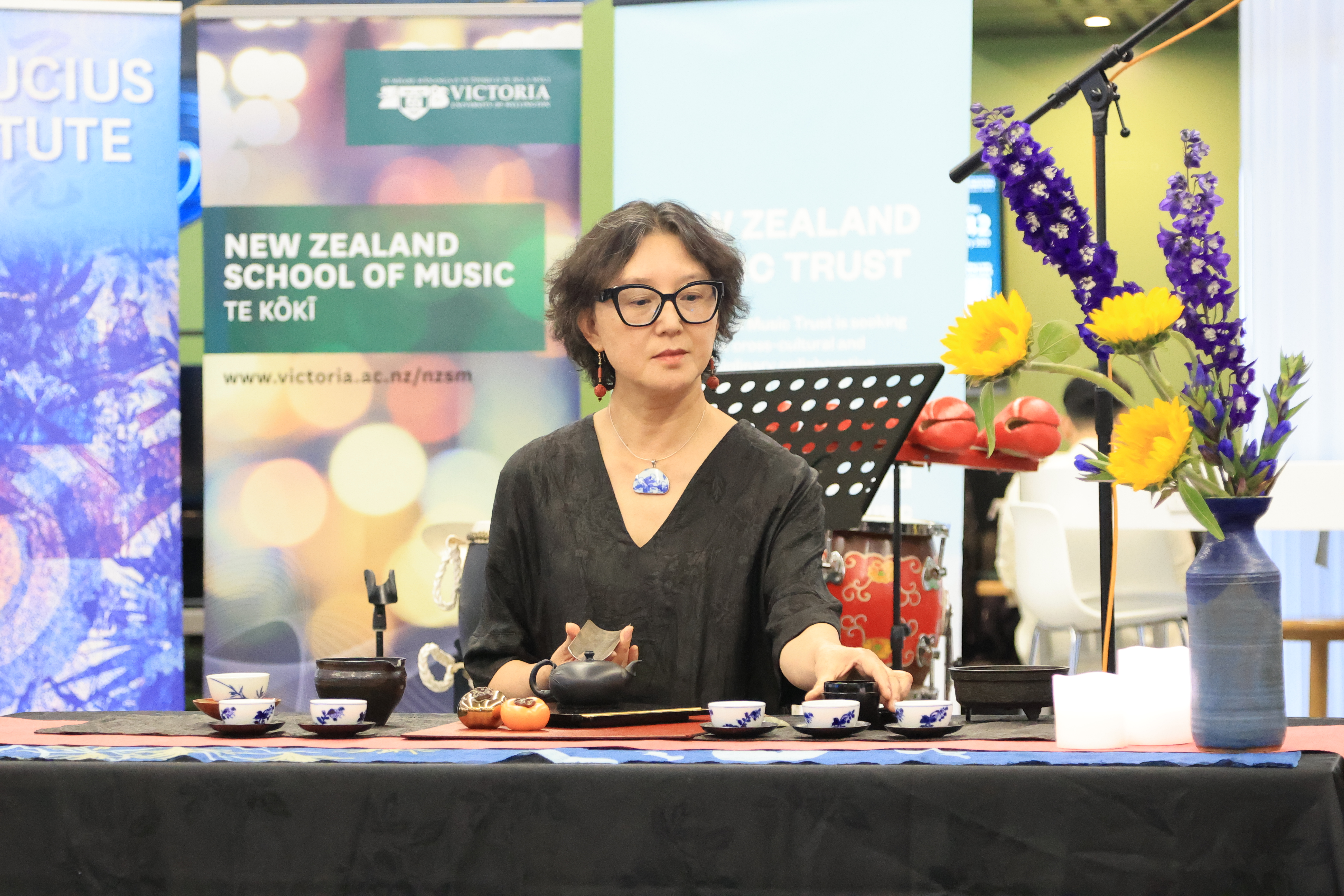 当地时间1月9日,作为大会的亮点之一,惠灵顿维多利亚大学孔子学院协助举办了一场融合中国茶艺与民族乐器表演的欢迎晚会。表演者通过行云流水般的动作,演绎了茶的冲泡技艺,细致展现了从备器、赏茶、润茶到冲泡、闻香、品茗的全过程,展示了中华茶文化的优雅与仪式感。孔子学院在音乐会现场还设置了品茗台,邀请与会嘉宾品尝乌龙茶、绿茶、白茶、红茶、茉莉花茶、桂花茶和桑葚枸杞玫瑰茶等。来自中国的艺术家们为观众呈现了一场融合多种中国民族乐器的演出,带来了《鹤鸣九皋》、《彩云追月》、《春江花月夜》等经典曲目,将音乐会一次又一次推向高潮。茶香与古乐交织,为观众带来了一场多感官交织的文化体验。