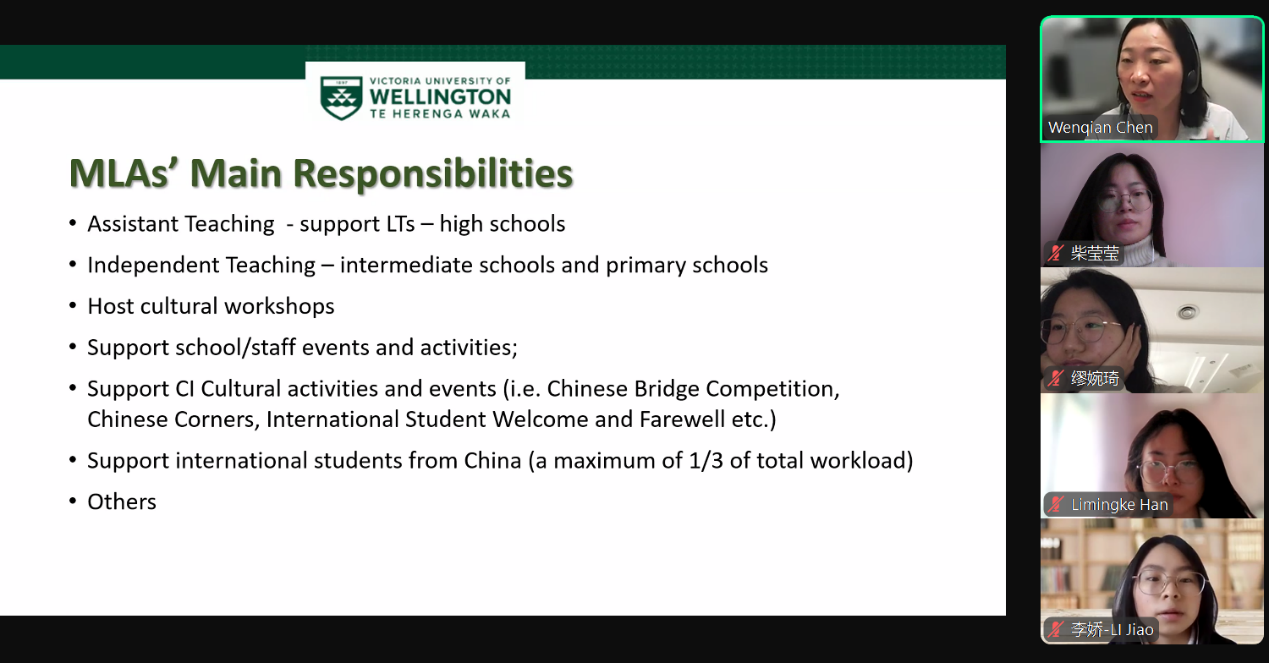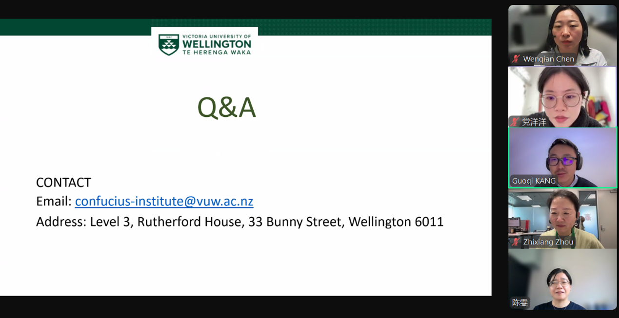 会议伊始,中文教师陈文倩详细介绍了孔院团队的分工情况,讲解了维大孔院中文教学点的分布,以及新西兰学校学制的安排,为教师和志愿者们更好地适应当地教学环境、精准开展教学工作提供了有力支持。