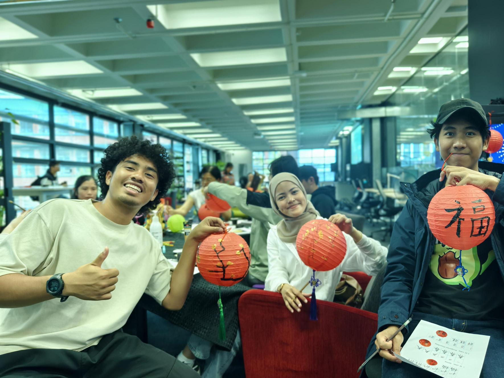活动现场布置了充满节日氛围的灯笼彩绘区,吸引了众多师生参与。在孔院中方院长陈雯教授和周志香老师的指导下,参与者用墨和颜料在灯笼上绘制图案与祝福语。无论是寓意吉祥的如意柿、梅花、竹子,还是充满创意的个性化设计,每一盏灯笼都展现了独特的节日祝愿。师生们将完成的灯笼带回家,为各自家庭增添浓厚的中国新年气息。