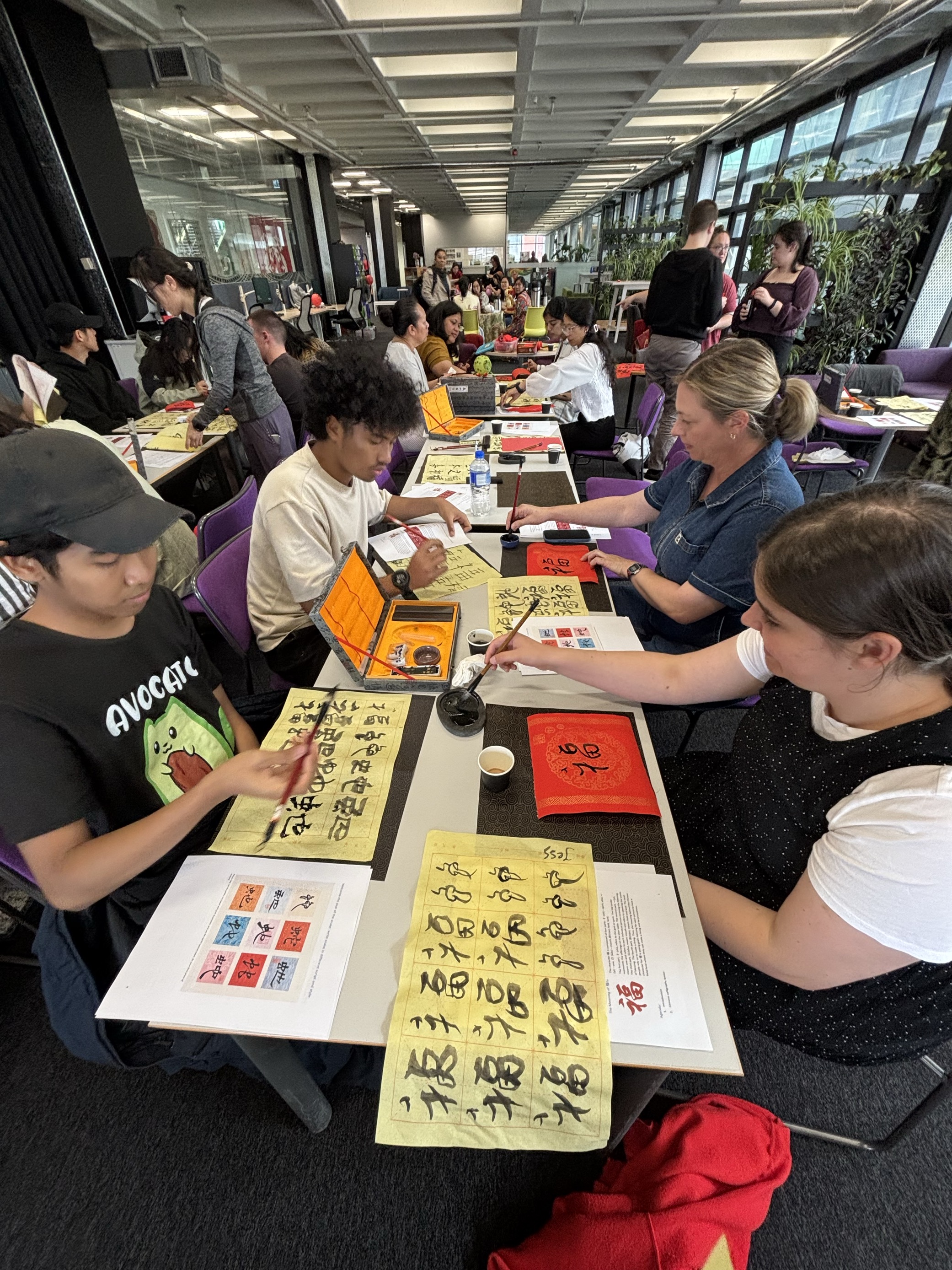 活动现场也邀请了孔院“发现中国”项目的华人书法家Alice Huang现场挥毫书写春联和“福”字,为师生送上新春祝福。不少师生在书法家的指导下,尝试用毛笔书写,感受汉字书写的艺术之美。作品完成后,参与者把自己的书法作品带回家作为纪念,或为家人朋友送上亲手书写的祝福。