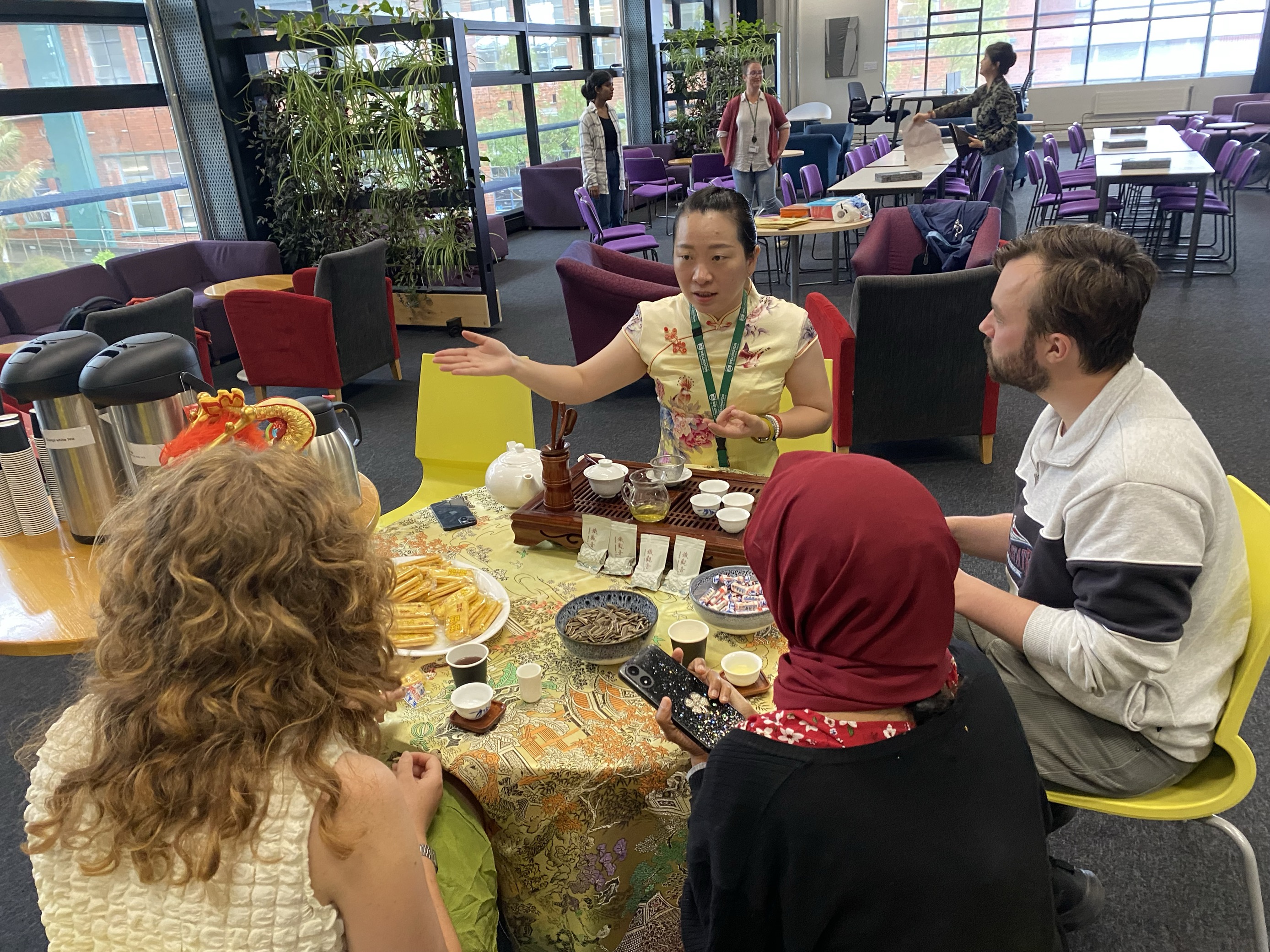 在茶艺展示区,陈文倩老师以优雅娴熟的技艺,向大家展示了铁观音的冲泡方式,孔院秘书Nicole也为师生们准备了白茶和花茶。随着茶汤的流转与香气的弥漫,茶文化的悠久历史和精神内涵也沁入心田。许多同学表示,通过活动更加了解了中国茶文化的深厚底蕴。